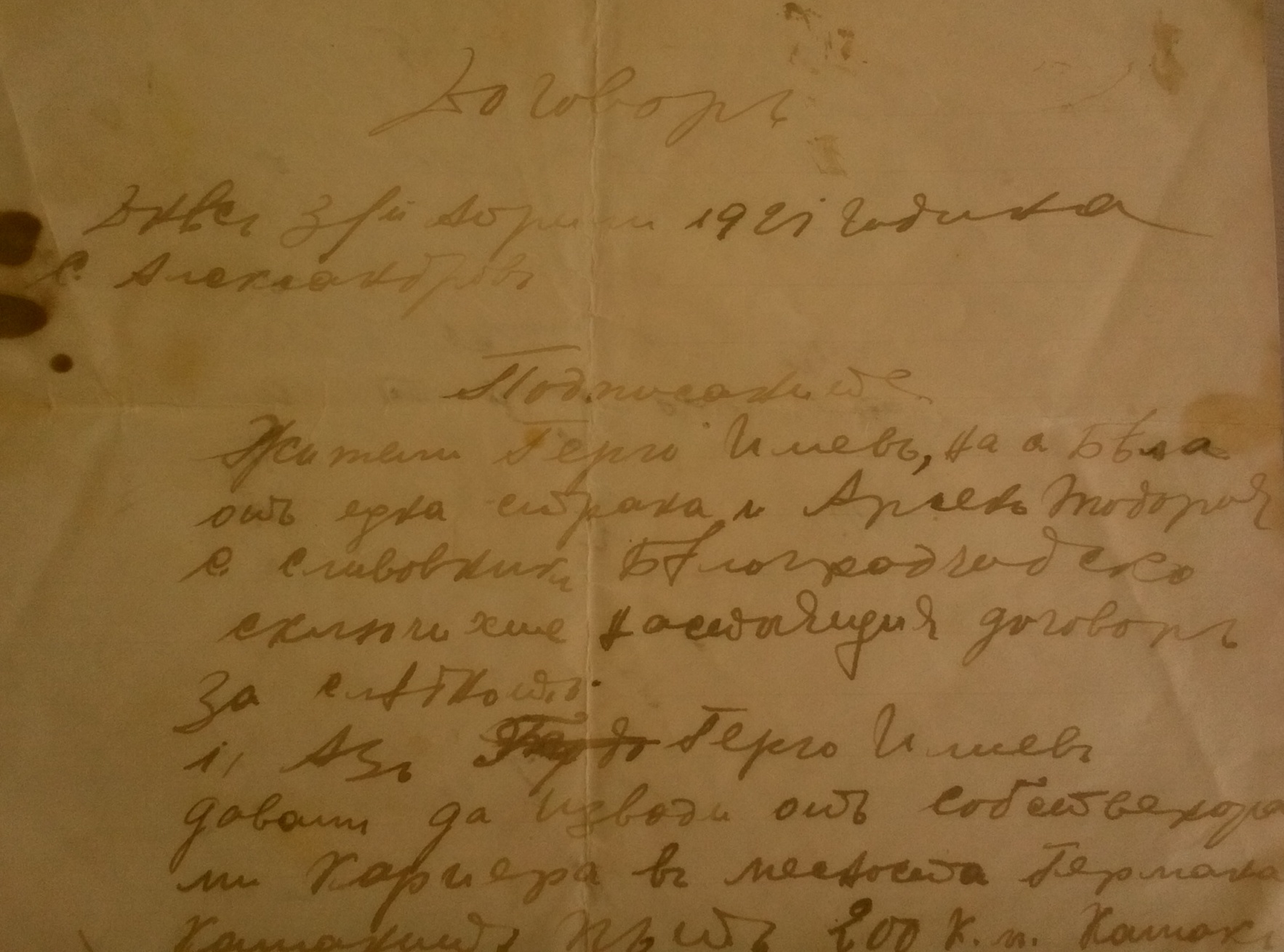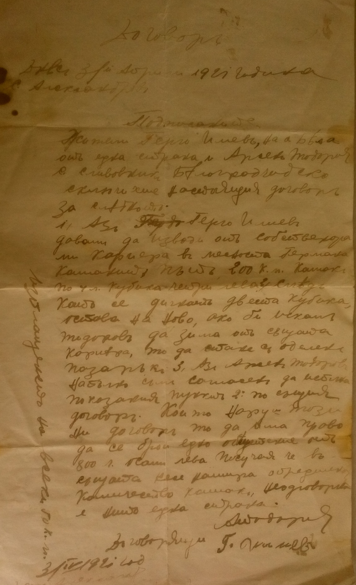 Договор 31.04.1921 г. между Герго Илиев и Ангел Тодоров от село Сливовник , окол. Белоградчишка; относно добив на 200к.м. камък от собствената кариера на Герго в местността „Германа“ с.Бела