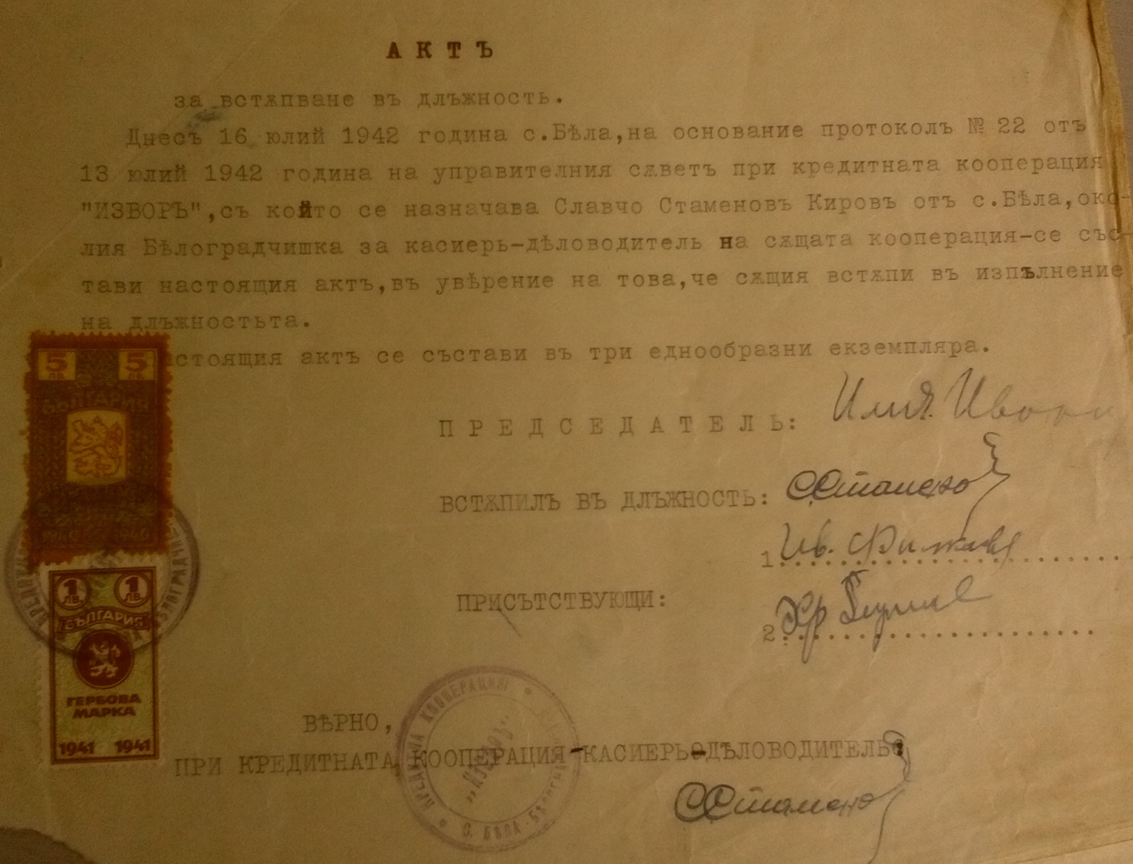 Днес 16.07.1942 год. за касиер деловодител на Кредитна Кооперация „ИЗВОР“ се назначава Славчо Стаменов Киров от с.Бела.
