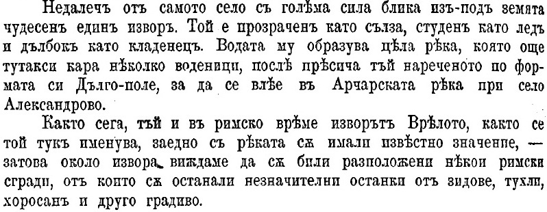 Недалеч от самото село с голяма сила блика из-под земята чудесен един извор. Той е прозрачен като сълза, студен като лед и дулбок като кладенец. Водата му образува цяла река, която още тутакси кара няколко воденици, после пресича тъй нареченото по формата си Дълго-поле, за да се влее в Арчарската река при село Александрово….