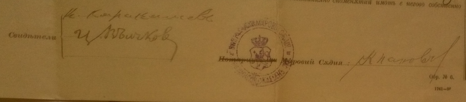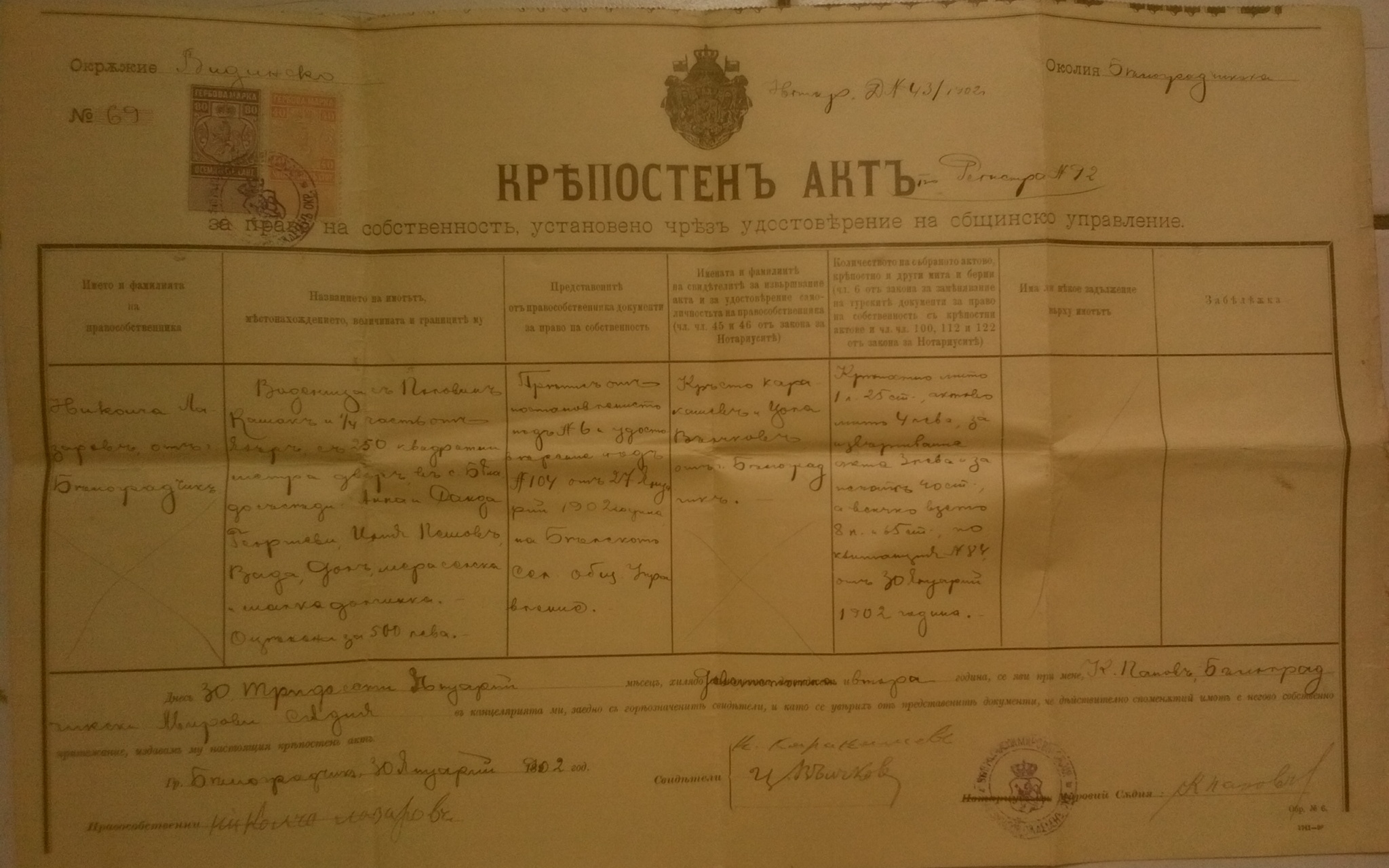 Днес на 30.09.1914 г. аз Николчо Лазаров срещу 100 000лева. предадох настоящия крепостен акт в собственост на Герго Илиев.