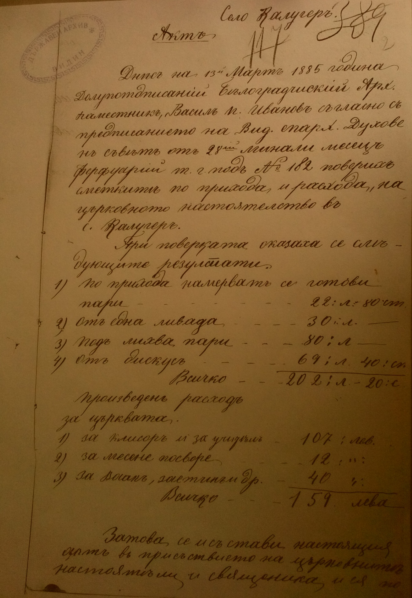 Днес на 13-ти Март 1885 година. Долуподписний Белоградчишкий Арх. наместник, Васил п.Иванов съгласно с предписанието на Вид. епарх. Духовен съвет от 28-ий минали месец Февруарий т.г. под N182 проверих сметките на църковното настоятелство в с.Калугер.