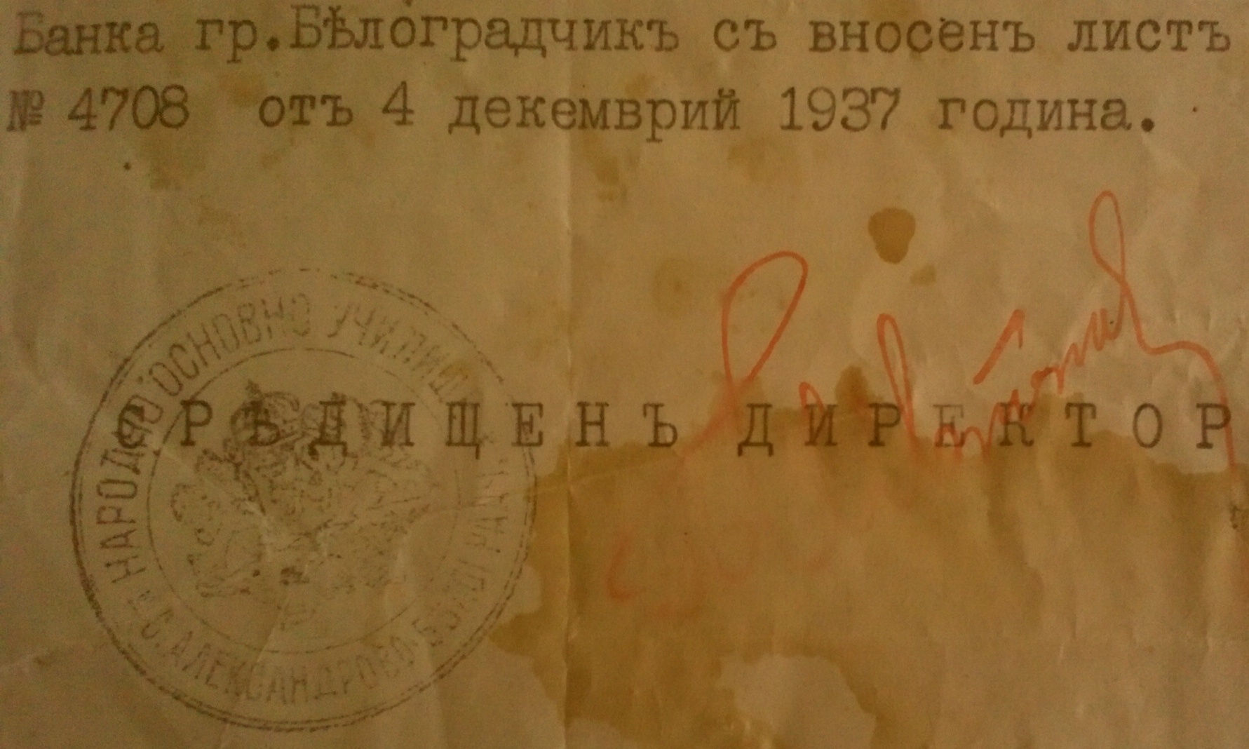 Събраните пари от Учениците в село Бела за „САМОЛЕТ БЪЛГАРСКО УЧИЛИЩЕ“ са внесени в Б.Н.Б. гр.Белоградчик с вносен лист контролен N 4708 от 04 Декемврий 1937 година.