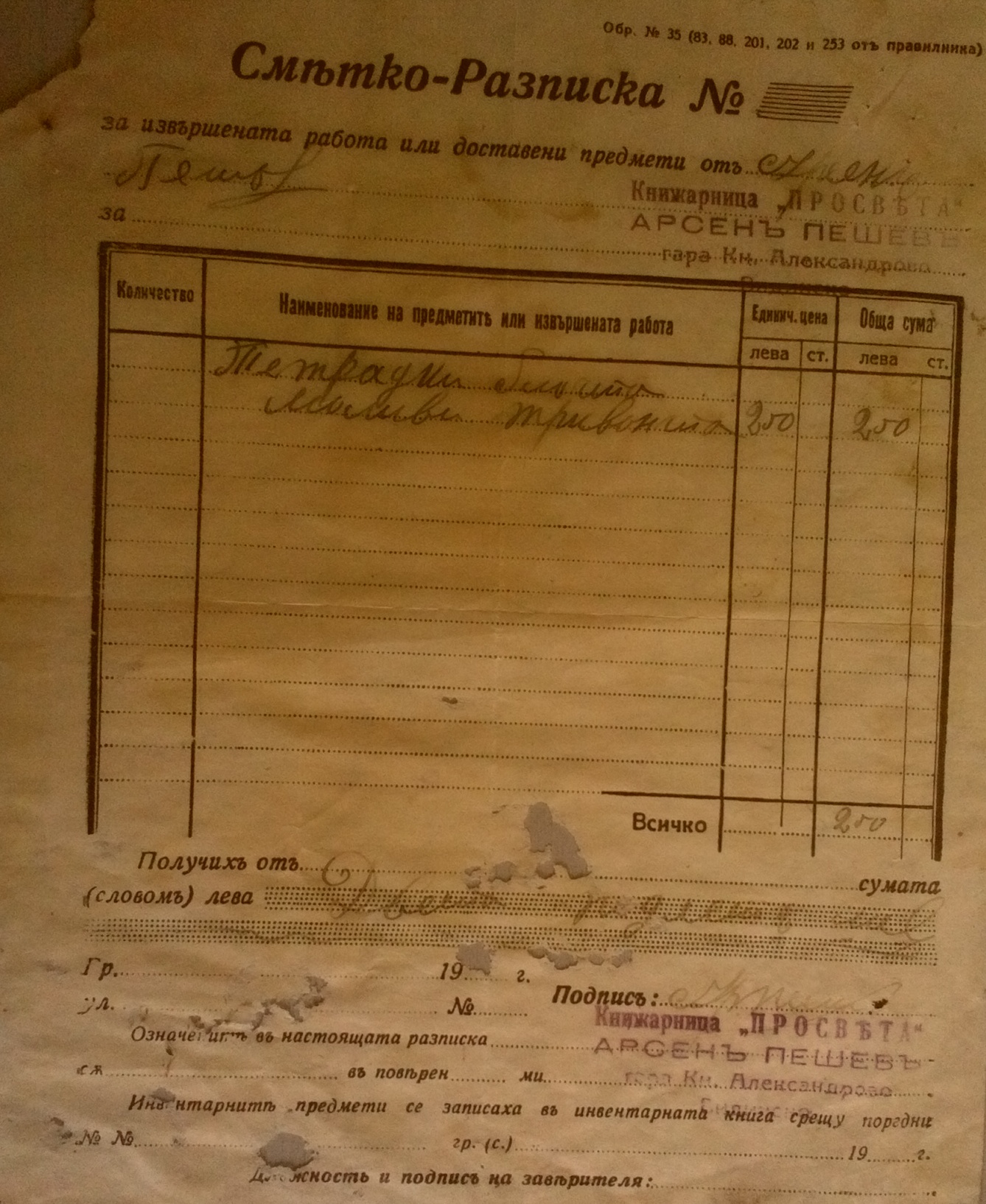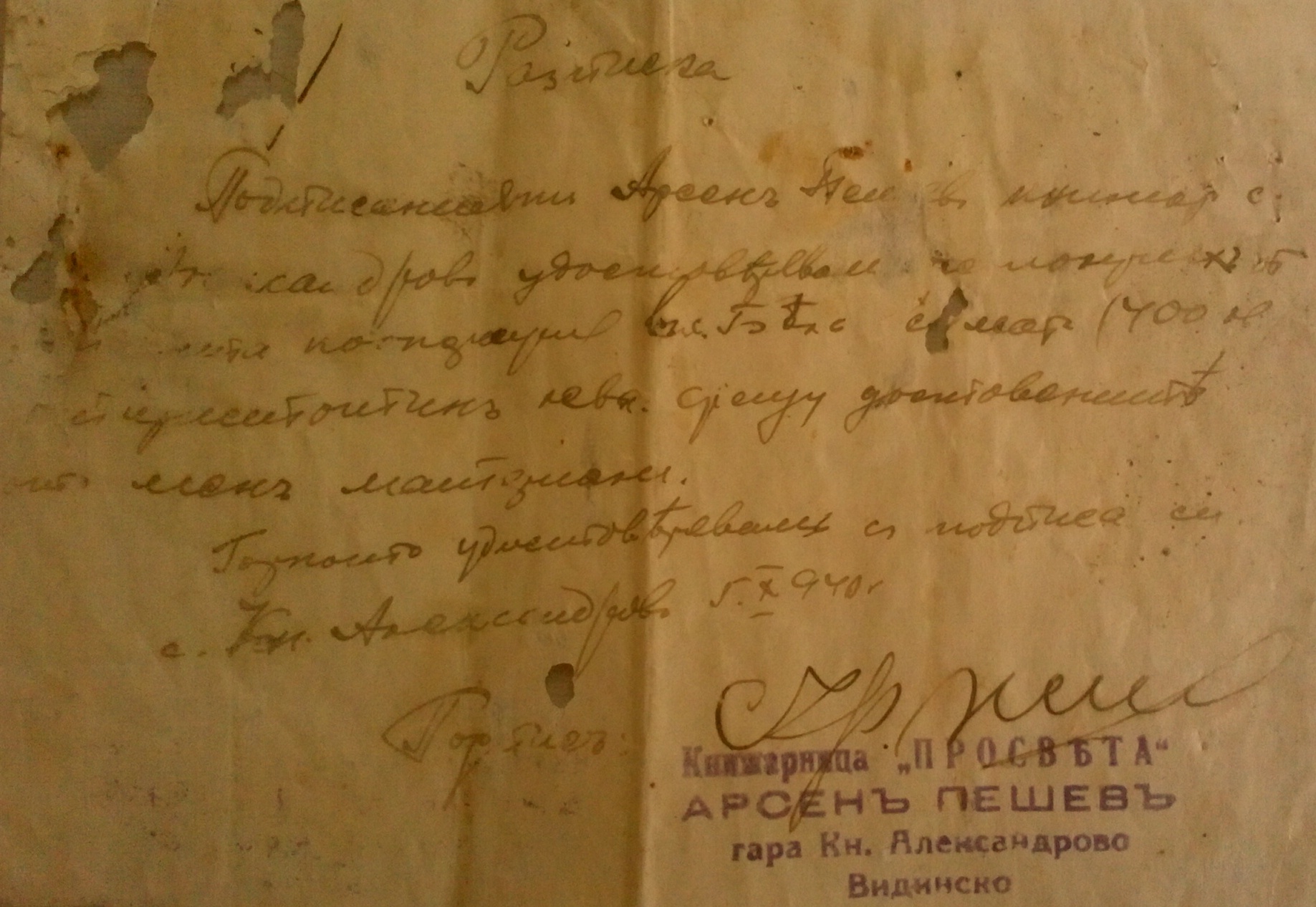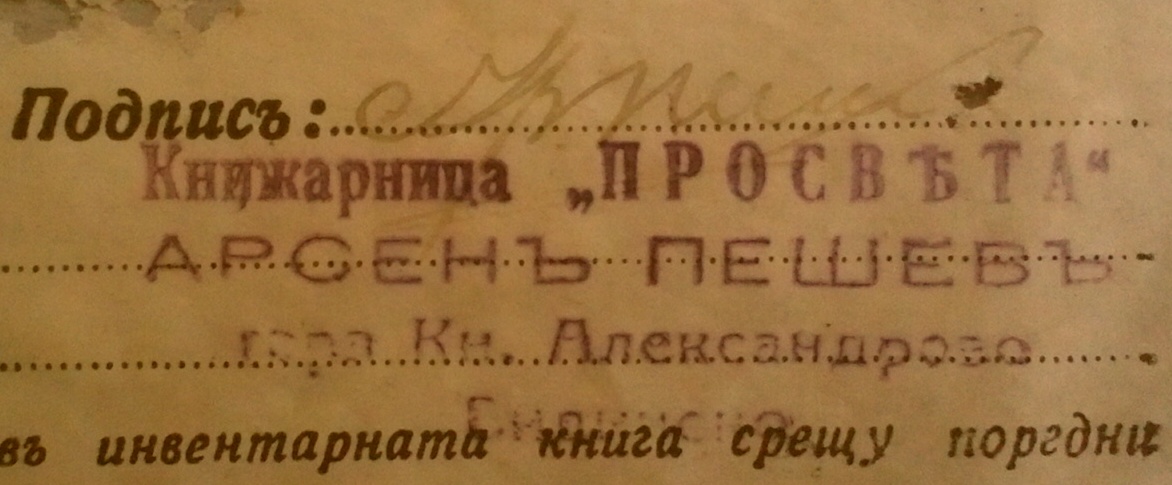 1940 год. 05. Октомври Книжарница „ПРОСВЕТА“ АРСЕНЪ ПЕШЕВЪ гара Княз Александрово.