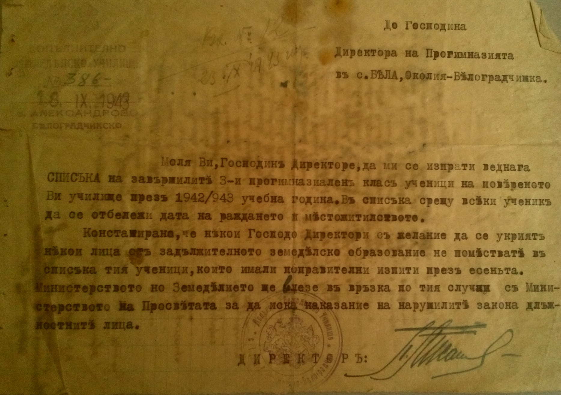 До Господина Директора на Прогимназията в с.Бела, Околия-Белоградчишка. No 386