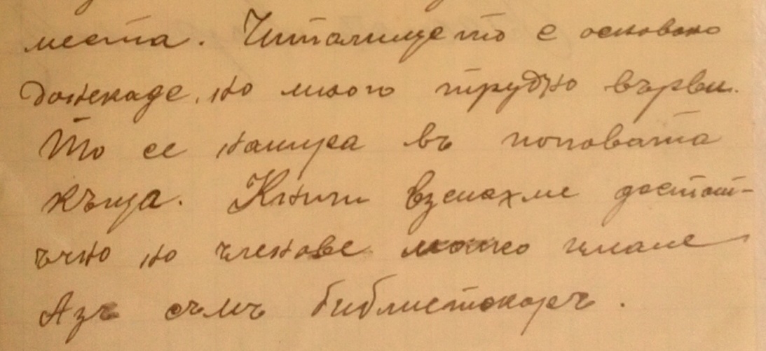 Читалището е основано донякъде, но много трудно върви. То се намира в поповата къща./поп Марко/ Книги взехме достатъчно но членове малко имаме. Аз съм библиотекар.