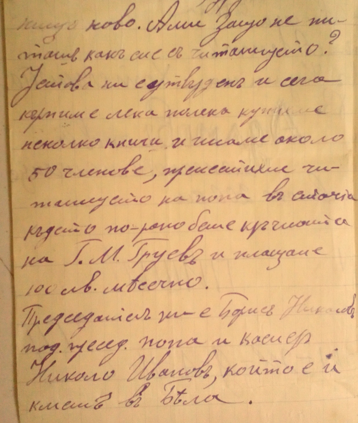 Устава ни е утвърден и сега кърпим лека полека, купихме няколко книги и имаме около 50 членове, преместихме Читалището на попа /поп Марко/ в стаята където по рано беше кръчмата на Г.М.Груев /Георги Миков Груев р.1906г. – п.1984г./ плащаме по 100 лева месечно. Председател ни е Борис Николов /Борис Николов Живков учител р.1901г. – поч.1984г./ подпредседател попа / Свещ.Марко Стоянов Велков п.1957 г./ и касиер Никола Иванов, който е и кмет в с.Бела / Николо Иванов Николов р.07.11.1895г. – п.07.12.1970г./