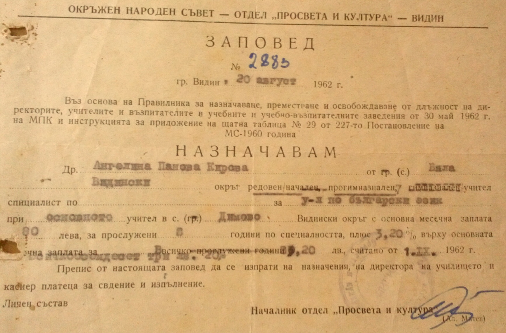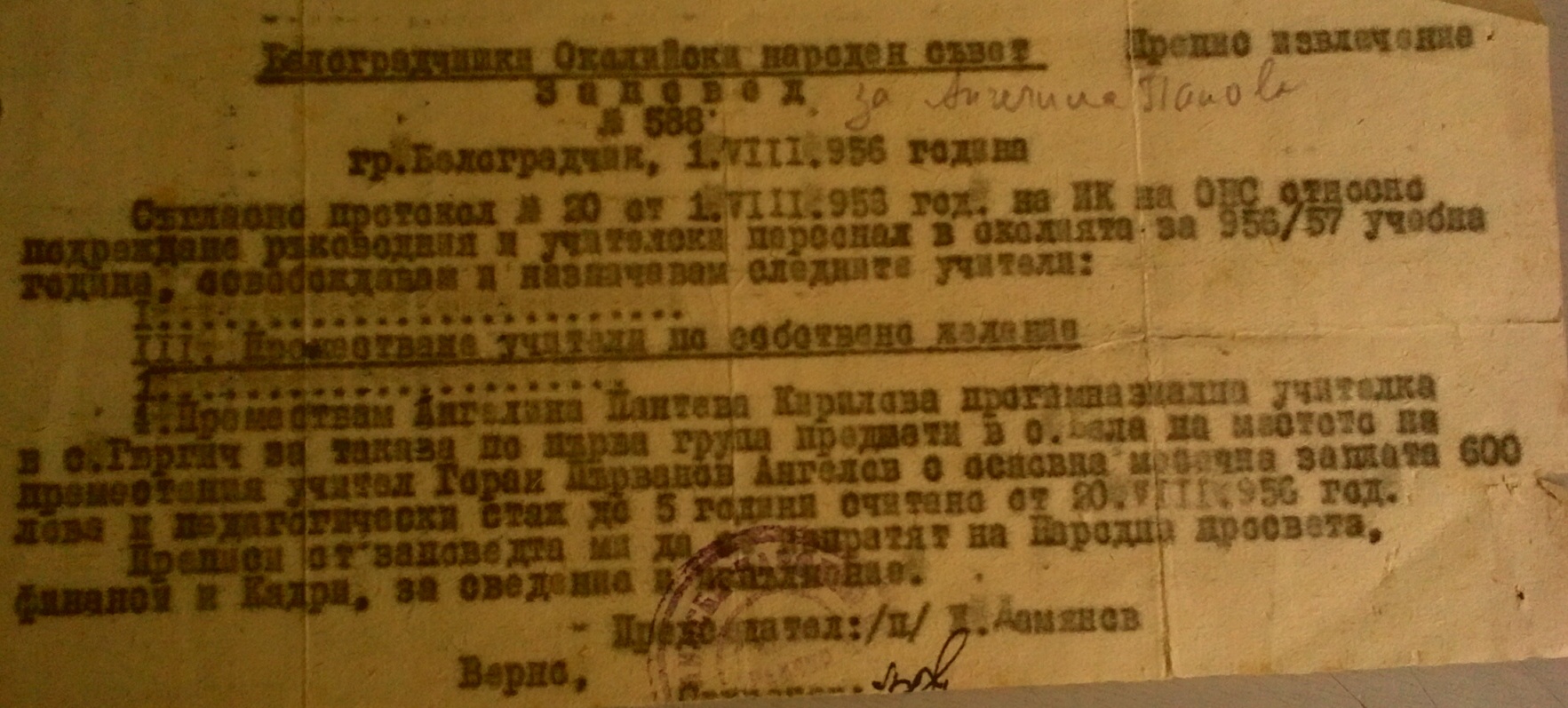 Преместване на учители по собствено желание. Премествам Ангелина Панова Кирова, прогимназиална учителка в село Гюргич за такава по първа група предмети в село Бела на мястото на преместения учител Горан Първанов Ангелов.