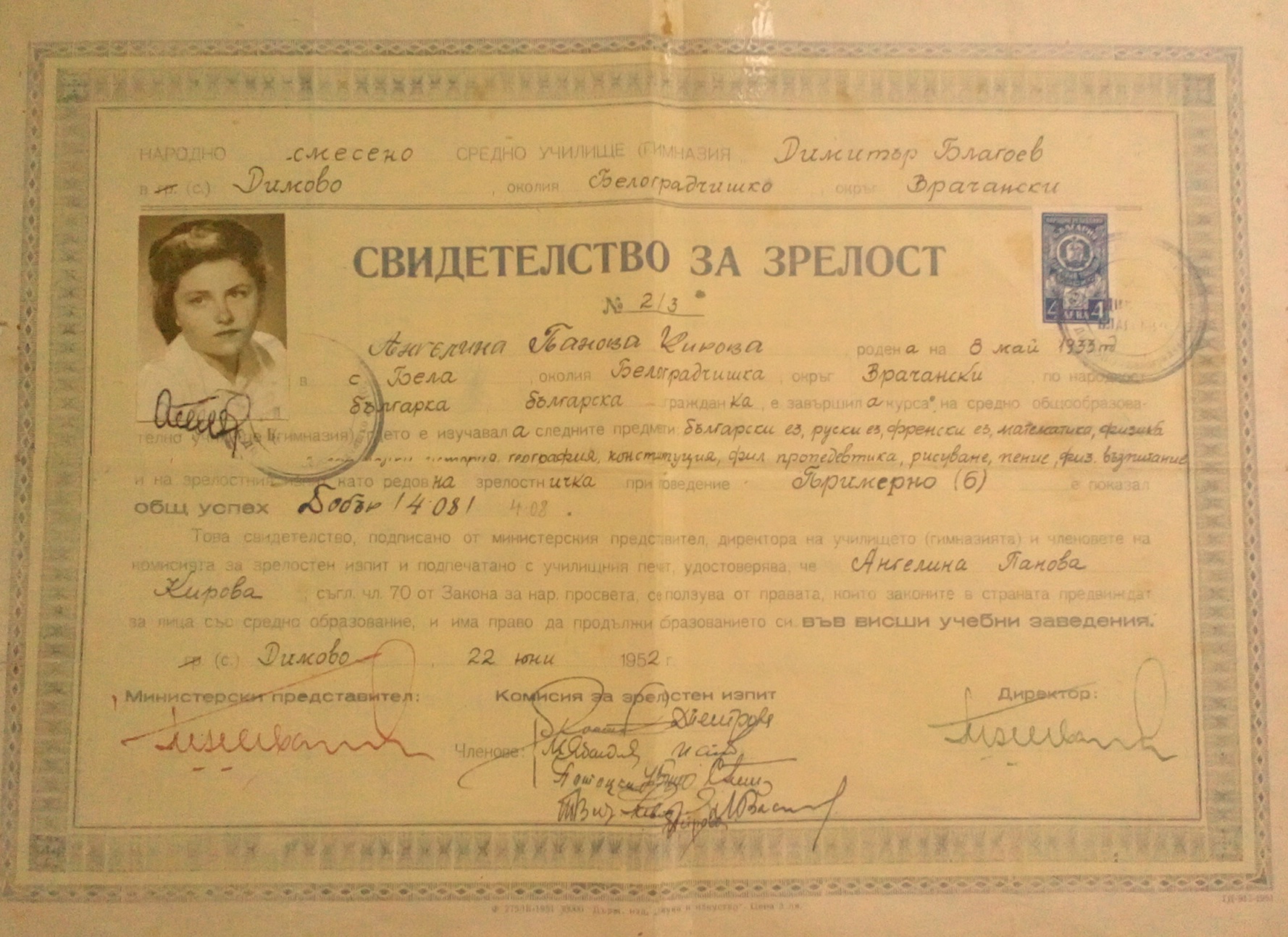 Учителка е в село Бела до 20 Август 1962 година, когато със зап.N2883 се премества в с.Димово.