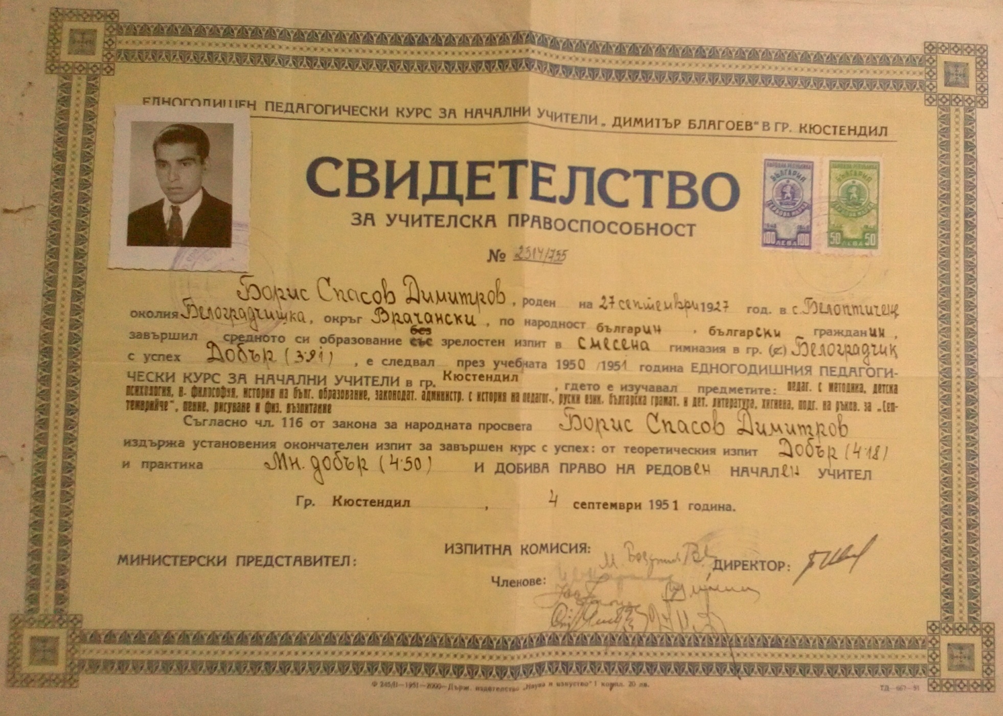 Завуршил едногодишния педагогически курс за начални учители в гр.Кюстендил през учебната 1950/51 година.