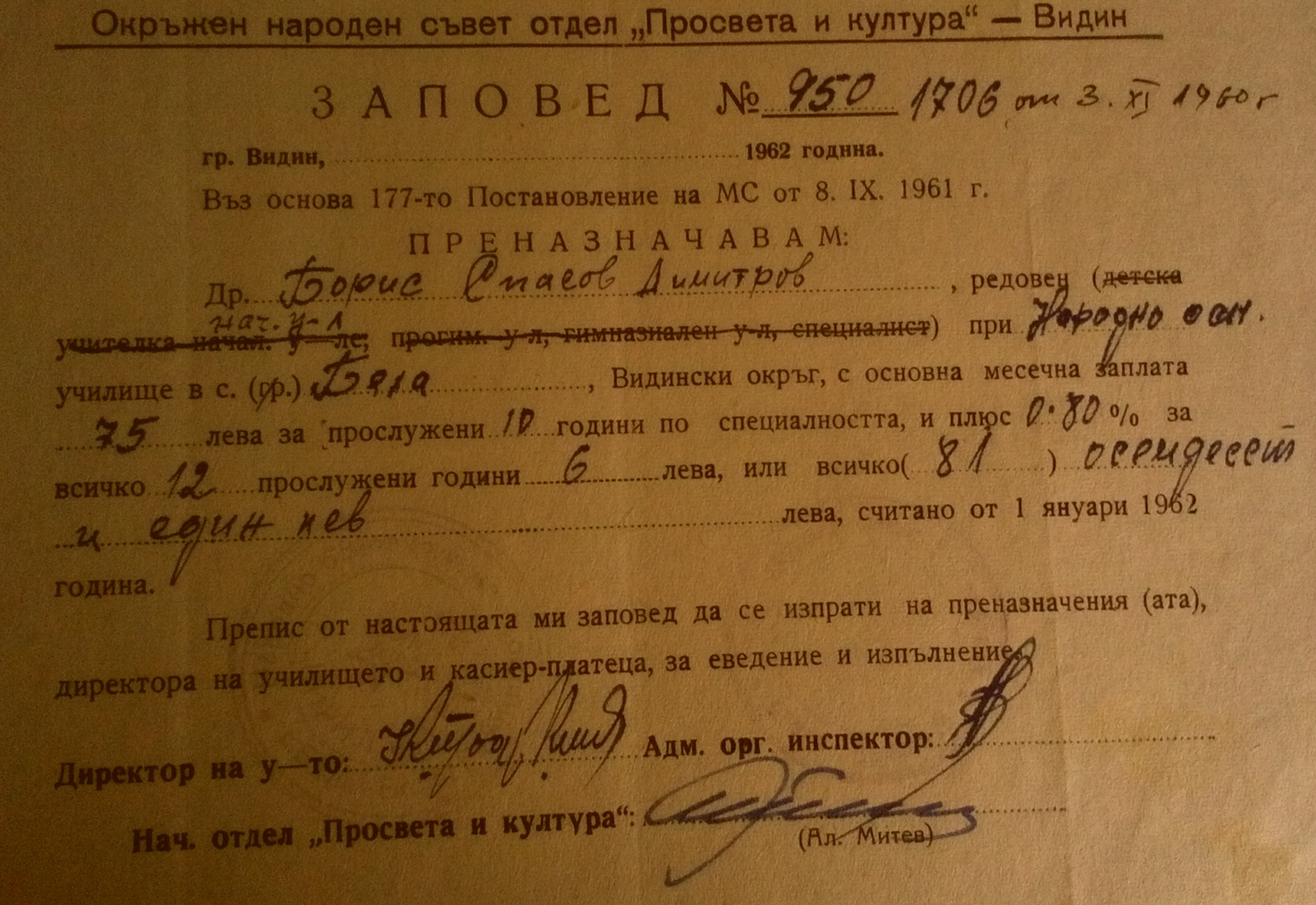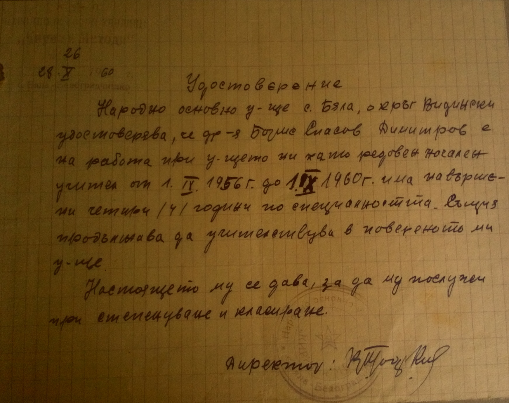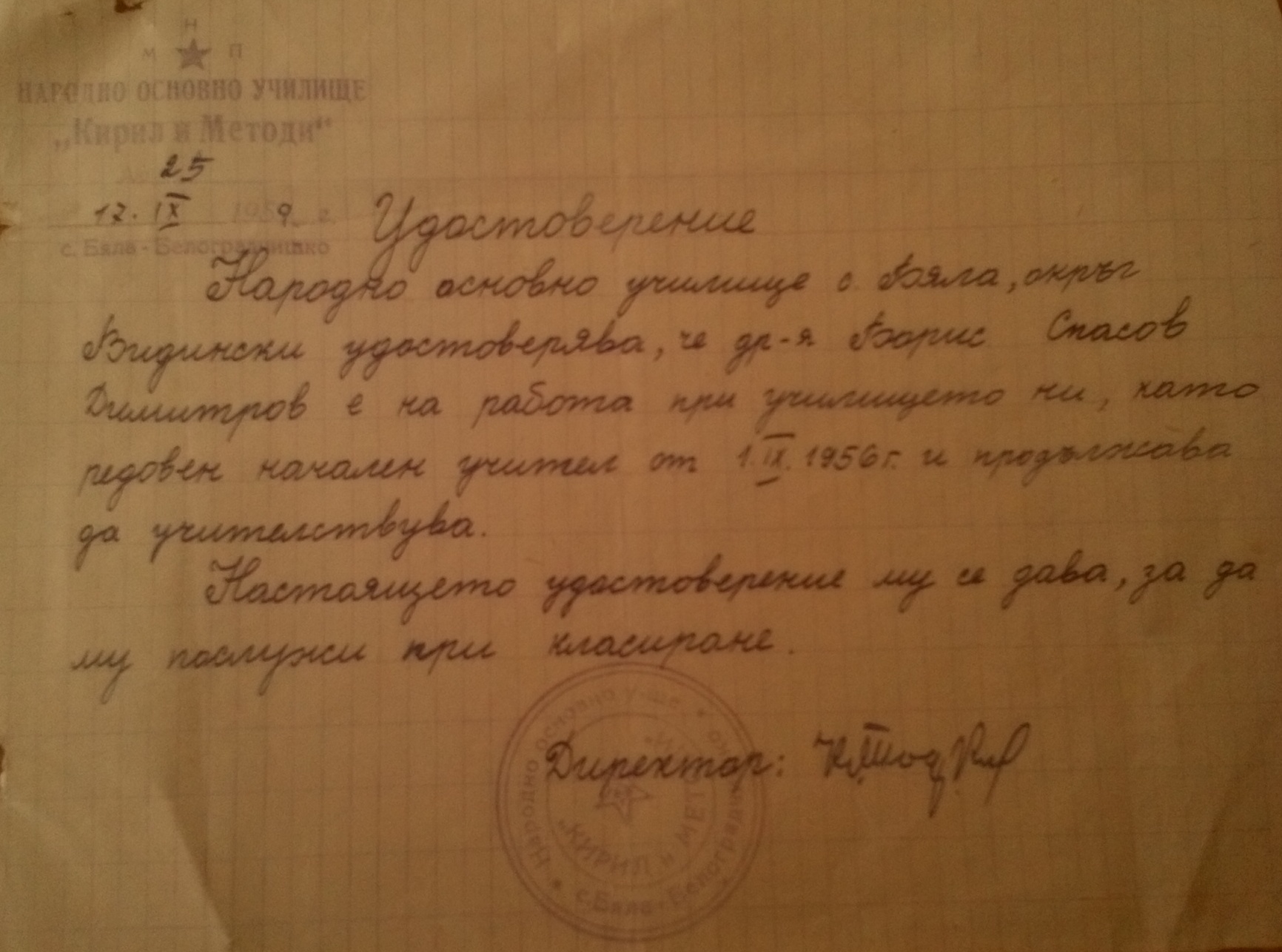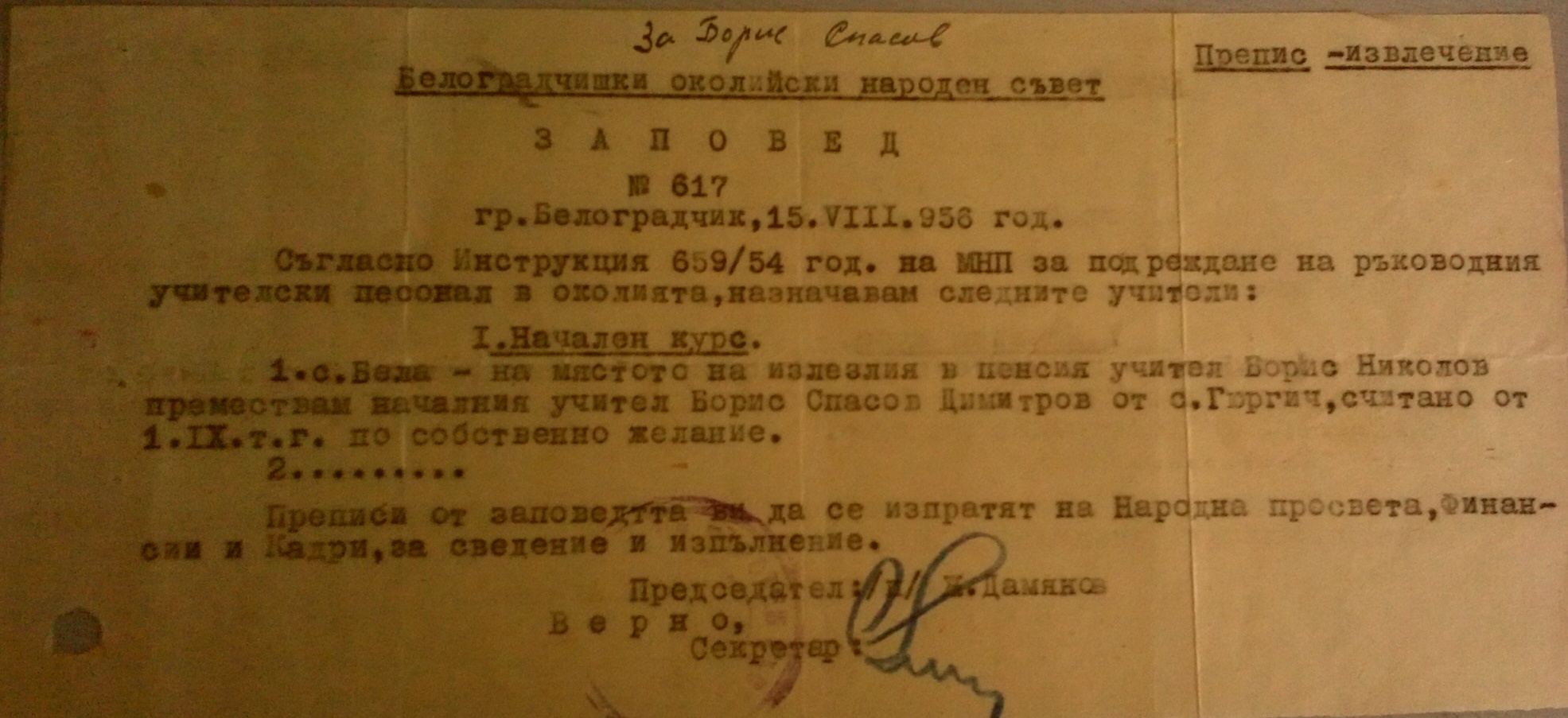 Начален курс, с.Бела на мястото на излезлия в пенсия учител Борис Николов Живков, премествам началния учител Борис Спасов Димитров от с.Гюргич считано от 09.01.1956 година по собствено желание.