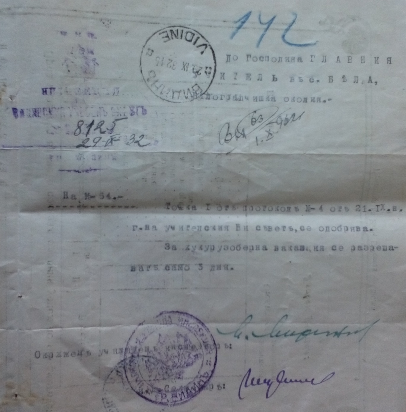 До Г-н Главния учител с.Бела от Окръжния инспектор гр.Видин М.Маринов.