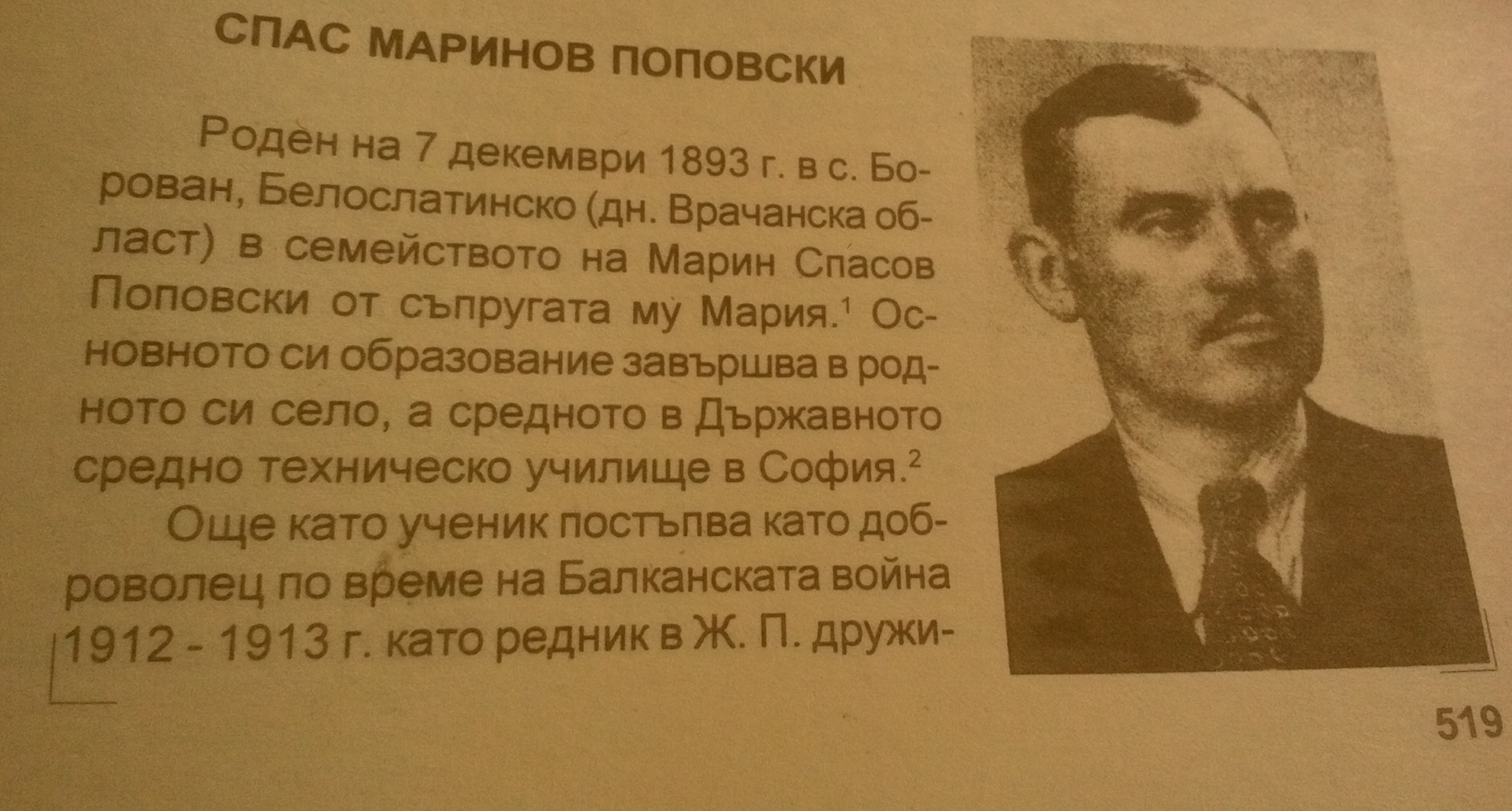 Спас Маринов Поповски е роден 07.12.1893 г. в село Борован, Белослатинско. Като ученик постъпва доброволец в Балканската война 1912 – 1913г. като редни в ж.п. дружина – автомобилно отделение. Взема участие и във Всеобщата война 1915 – 1919 г. Завършва школата за запасни офицери в Княжево. Като кандидат подофицер е назначен в трети тежък Видински полк, артилерия. По късно е произведен в поручик и е адютант на полка. За проявена храброст в боевете е награден с орден „За храброст“.