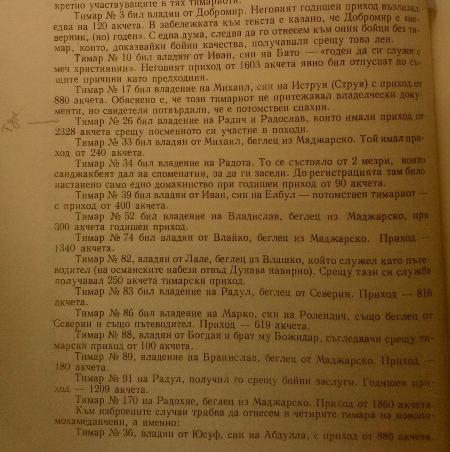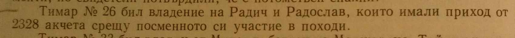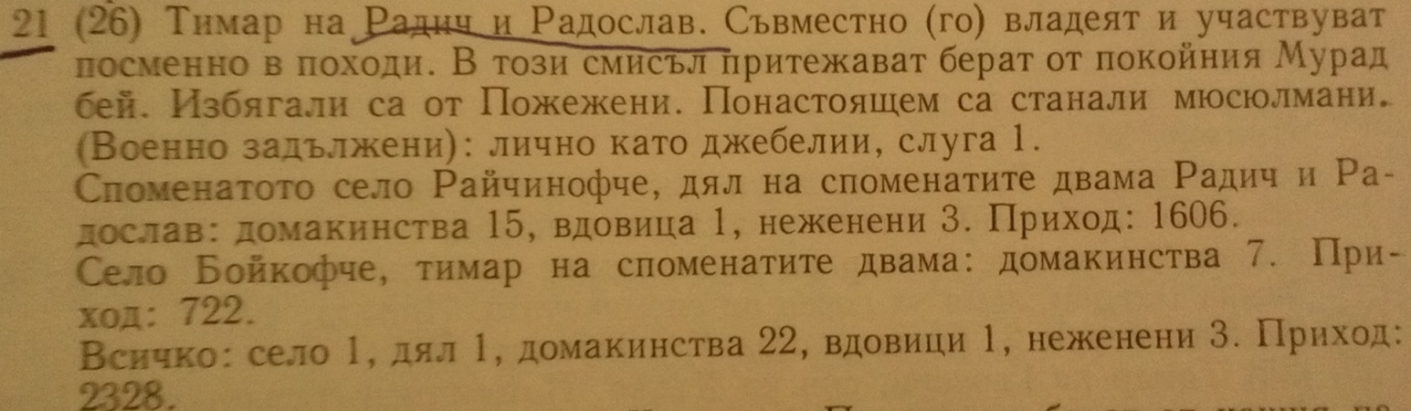 - Тимар №26 бил владение на Радич и Радослав, които имали приход 2328 акчета срещу посменното си участие в походи. Те са спохии християни. Съвместно го владеят. Притежават берат от покойния Мурат бей. Избягали са от Пожежени. Понастоящем са станали мюсюлмани. Военно задължени. Лично като джебелии, 1 слуга. Споменатото село Райчиновче, дял на споменатите двама: домакинства 15, вдовица 1, неженени 3, приход 1606 Сеоло Бойковче, тимар на споменатите двама, домакинства 7, приход 722. Те са бегълци от Пожижен , Маджарско.