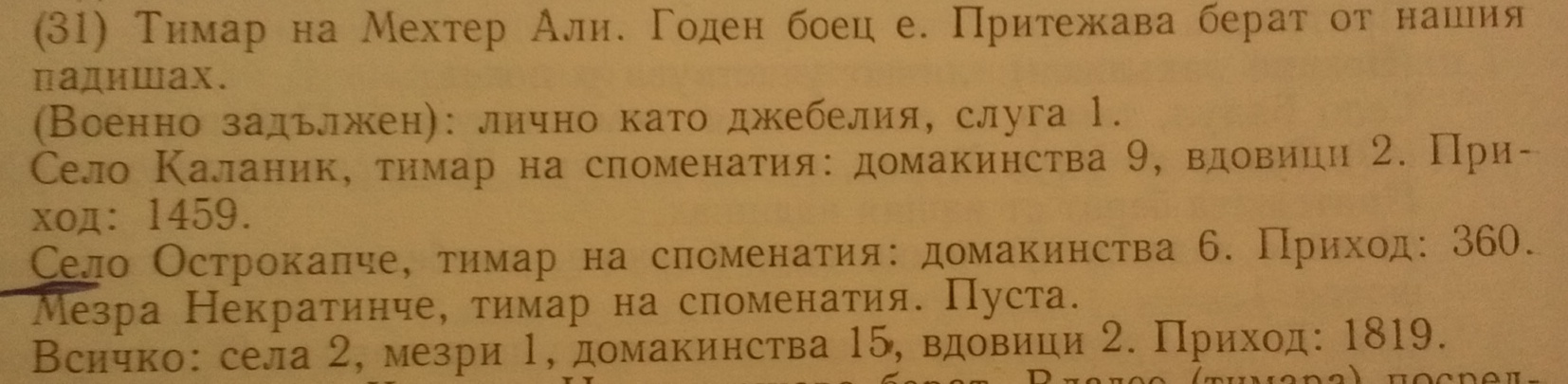 - +Острокапче, тимар на Мехтер Али, притежава берат от падишаха. Тимара се състои от домакинства 6, приход 360.