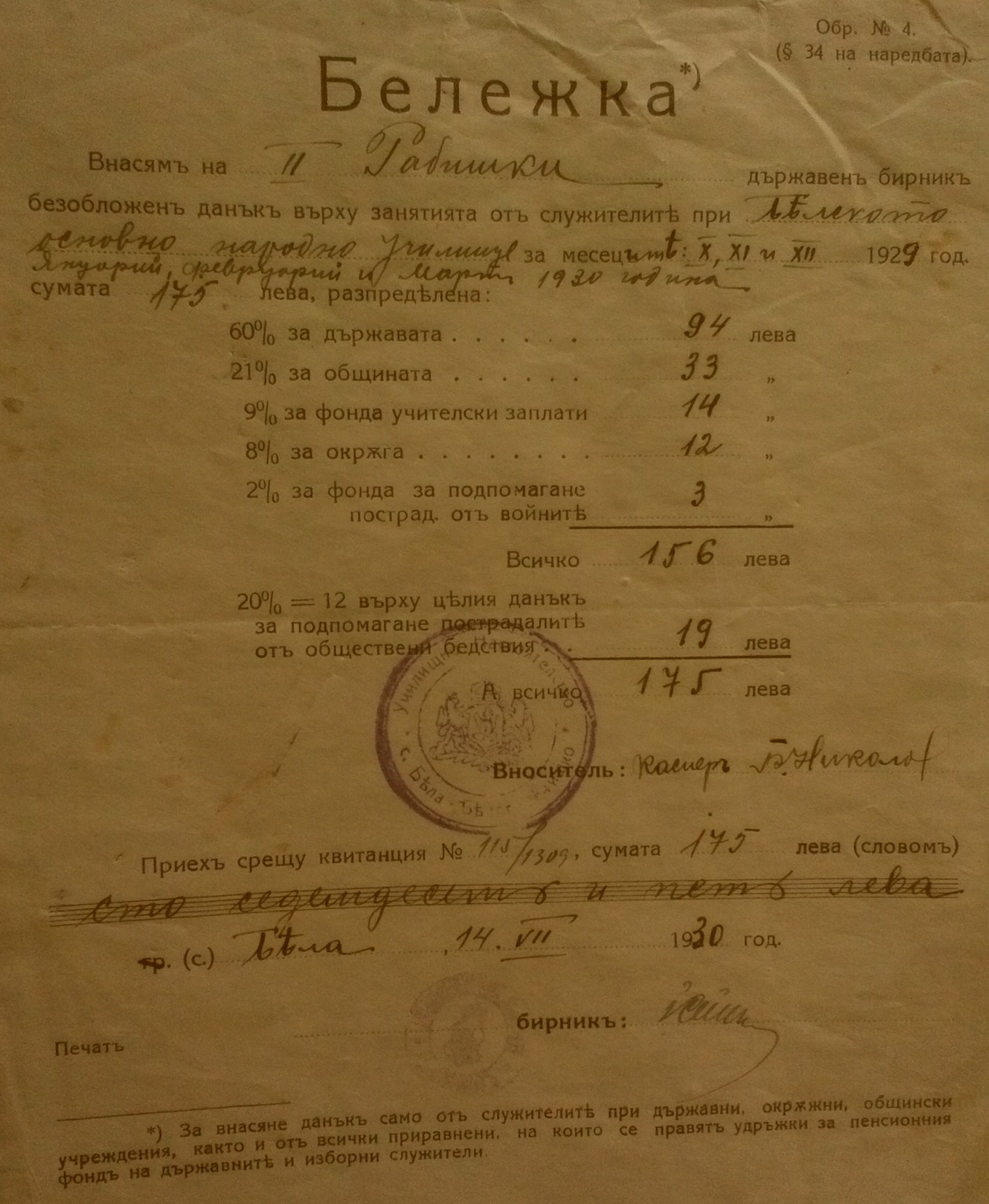 БЕЛЕЖКА , безобложен данък от м.Октомври 1929г. до м.Юли 1930г.