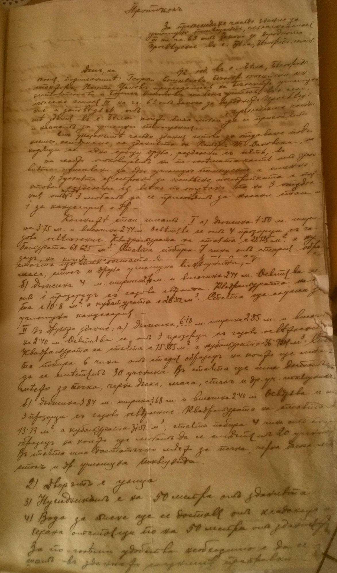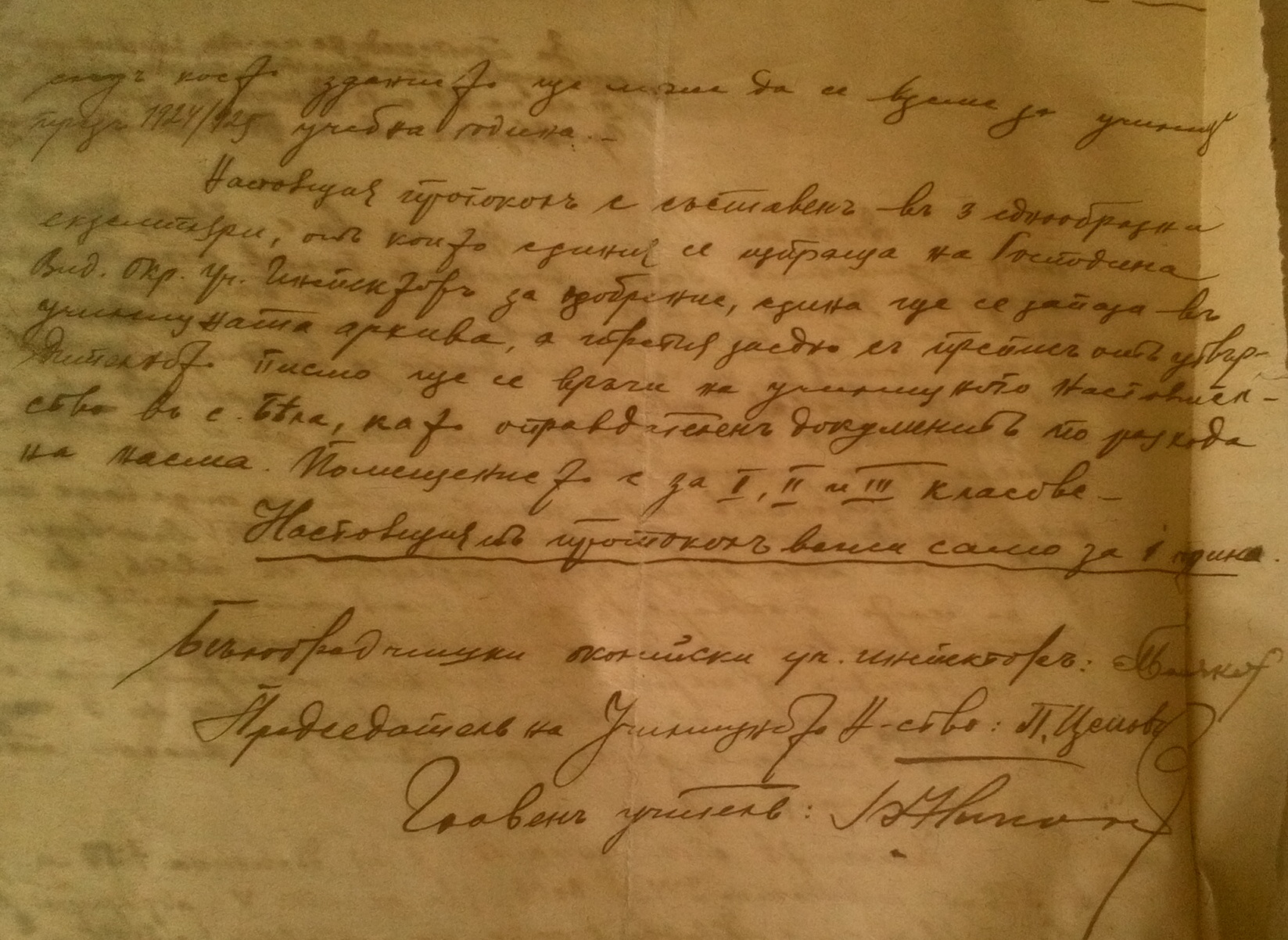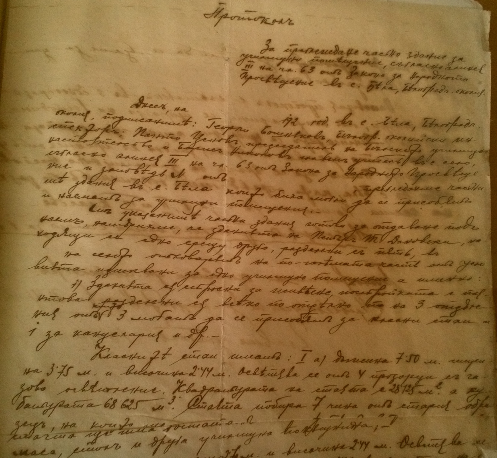 Днес на …….. в село Бела, Белоградчишко, подписаните: Георги Бошняков, Белоградчишки околийски инспектор; Панто Ценов, председател на Белското Училищно настоятелство и Борис Николов, главен учител в селото, съгласно ал.3, на чл. 63 от закона за Народното Просвещение и заповед …… прегледахме частните здания в село Бела, които биха могли да се приспособят и наемат за училищни помещения ….
