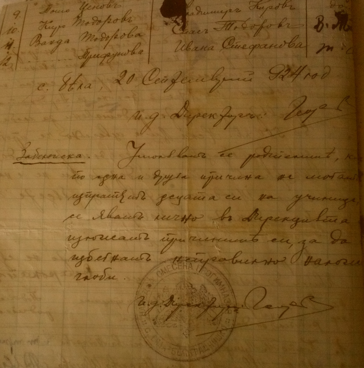 Съобщава ви се Господине, да изпратите детето си на училище най-късно до 22.09.1924г. в противен случай на основание чл.39 от закона за Народната Просвета ще бъдете представени за глоба от 500 лева. Прогимназиалното образование е задължително до 14 години.