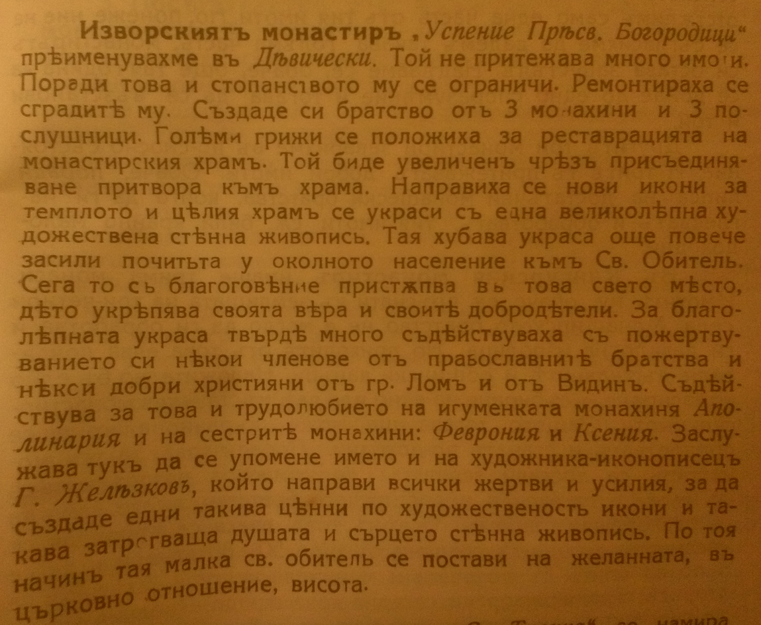 Изворският манастир „Успение Пресв. Богородици “ преименувахме в Девически. Той не приежава много имоти. Поради това и стопанството му се ограничи. Ремонтираха се сградите му. Създаде се братство от 3-ри монахини и 3-ма послушници. Големи грижи се положиха за реставрацията на монастирския храм. Той биде увеличен чрез присъединяване притвора кум храма. Направиха се нови икони за темплото и храм се украси с една великолепна художествена стенна живопис. Тая хубава украса още повече увеличи почитта у околното население кум Св. Обител. Сега то с благоговение пристъпва в това свето место, дето укрепва своята вера и своите добродетели. За благолепната украса твърде много съдействаха с пожертвуванието си некой членове от православните братства и некой християни от град Лом и от Видин. Съдействува за това и трудолюбието на игуменката монахиня Аполинария и на сестрите: Феврония и Ксения. Заслужава тук да се упомене името и на художника – иконописец Г.Желязков, който направи всички жертви и усилия, за да създаде едни такива ценни по художественост икони и такава затрогваща душата и сърцето стенна живопис. По тоя начин тая малка св.обител се постави на желаната, в църковно отношение, висота.