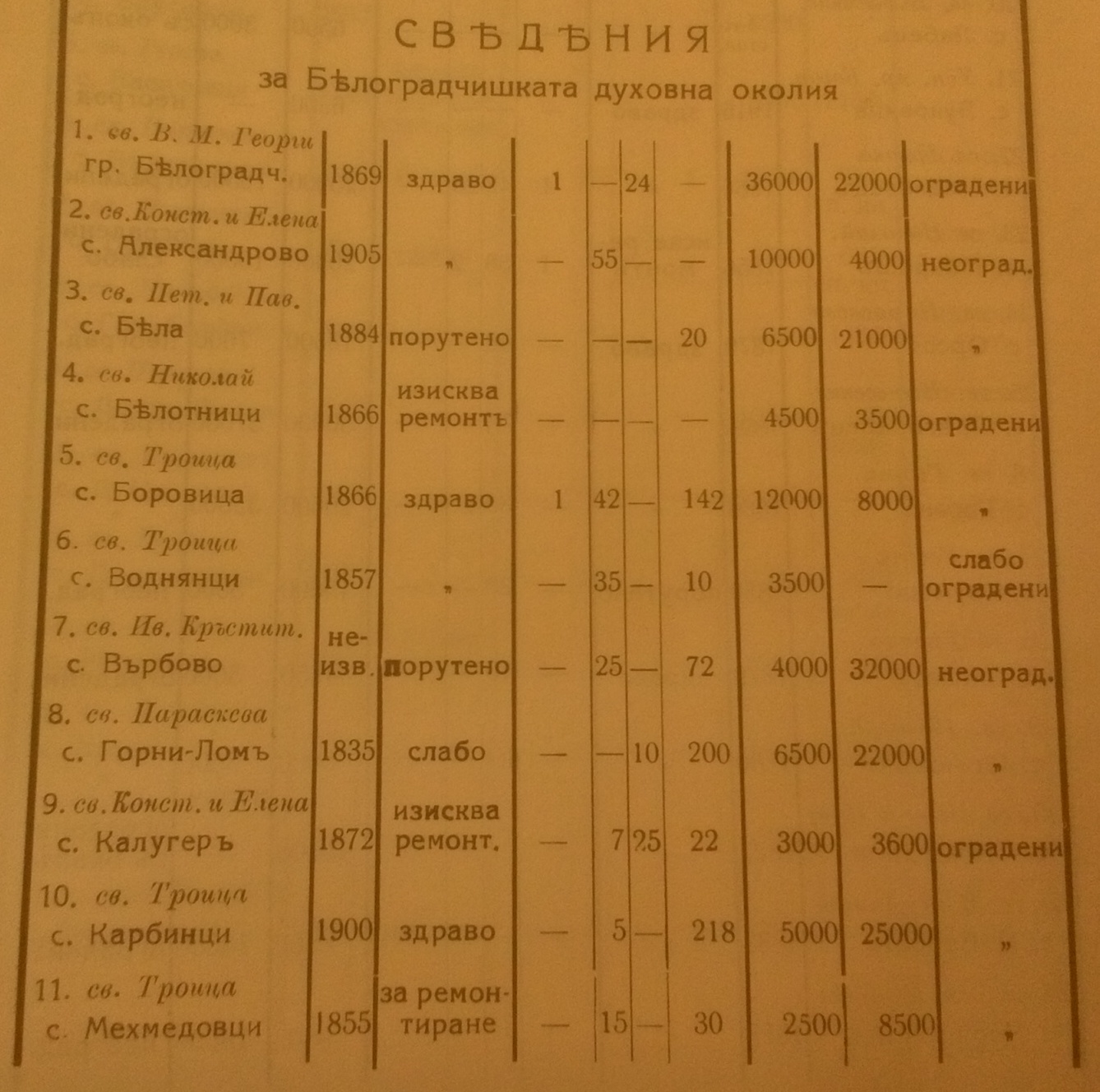 Село Бела, Св. Петър и Павел, съградена 1884 г. , състояние сега „порутено“, сгради – 1 , Ниви , ливади – нямя, гора 20 декара, Средногодишен приход-разход 6500лв., Излишеци – 21000лв., Неоградена.