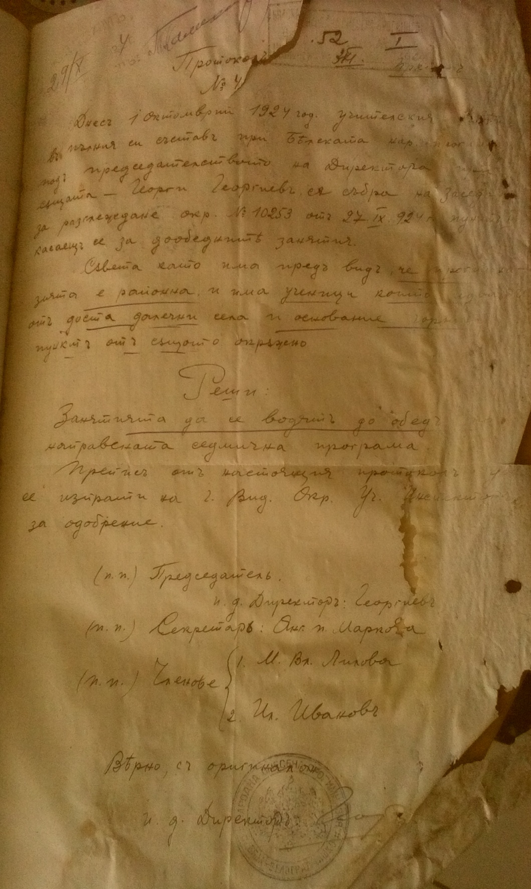 Днес 1-ви Октомврий 1924 година, Учителския съвет се събра в пълния си състав при Белската Народна Смесена Прогимназия под: председателството на Директора на същата – Георги Георгиев. Разгледа Окръжно No 1253 от 27.09.1924 г. касаещ се дообедните занятия.