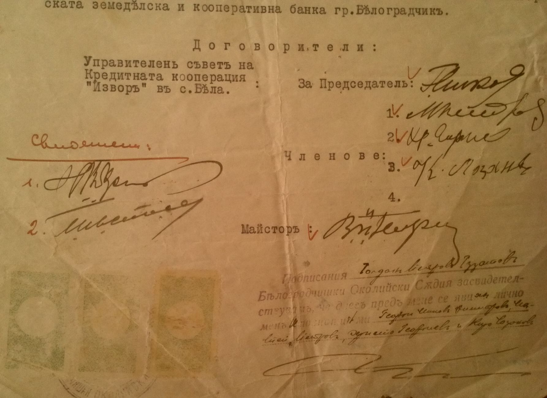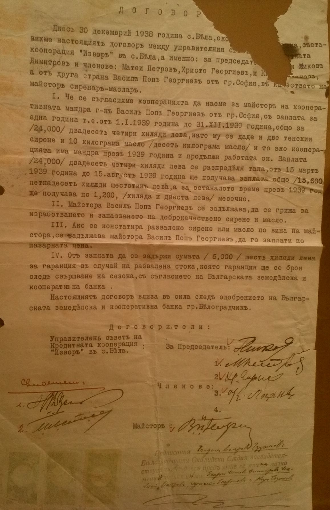 Днес 30.12.1938 год. се сключи договор между управителния съвет на Кооперация „ИЗВОР“ Председател: Георги Миков Димитров