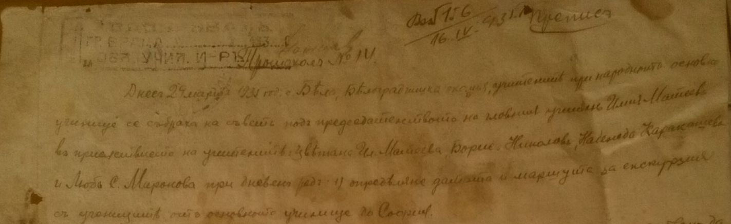 Днес 29.03.1935 година с.Бела , Белоградчишка околия, учителите при Народното Основно Училище се събраха на съвет под председателството на главния учител Илия Матеев в присъствието на учителите: Цветана Ил.Матеева , Борис Николов, Надежда Каракашева и Люба С. Миронова при дневен ред.