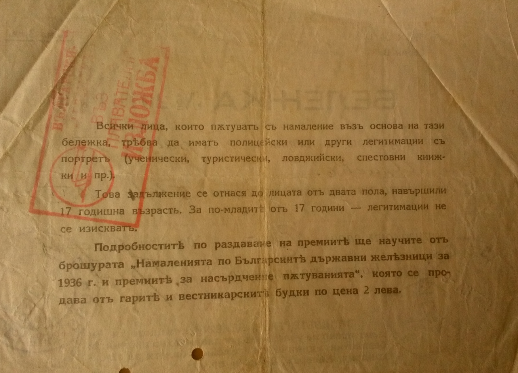 1936 год. 20.Септември – Бележка за пътуване с БДЖ издадена от Белското Селско Общинско Управление.