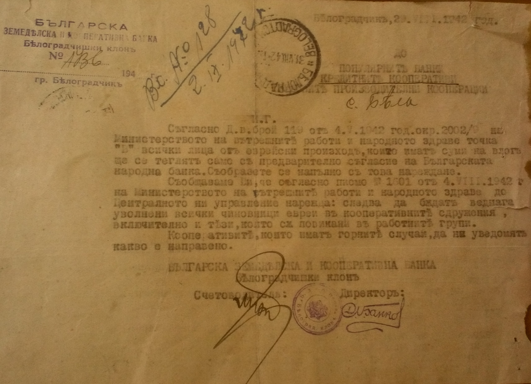 Съгласно Д.в. брой 119 от 4.05.1942г. и окр. Не 2002/9 на Министерството на вътрешните работи и народното здраве точка „В“ всички лица от еврейски произход, които имат суми на влог ще се теглят само с предварително съгласие …..