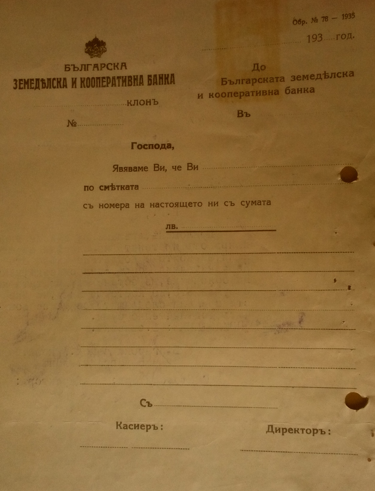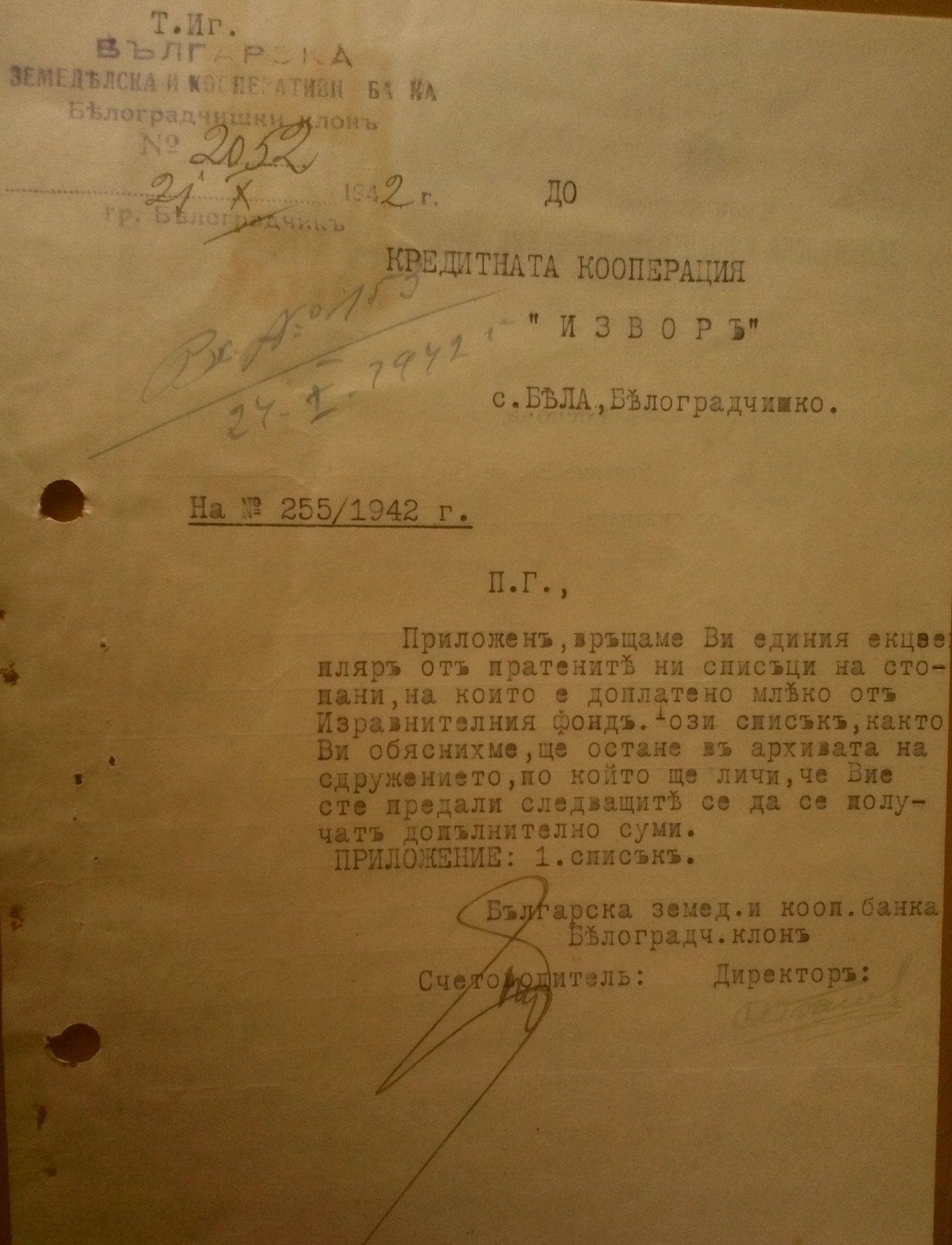 1942 год. 21 Октомври – Б.З.К.Б. клон Белоградчик до Кооперация „ИЗВОР“, доплащане на мляко от (Изравнителния Фонд).