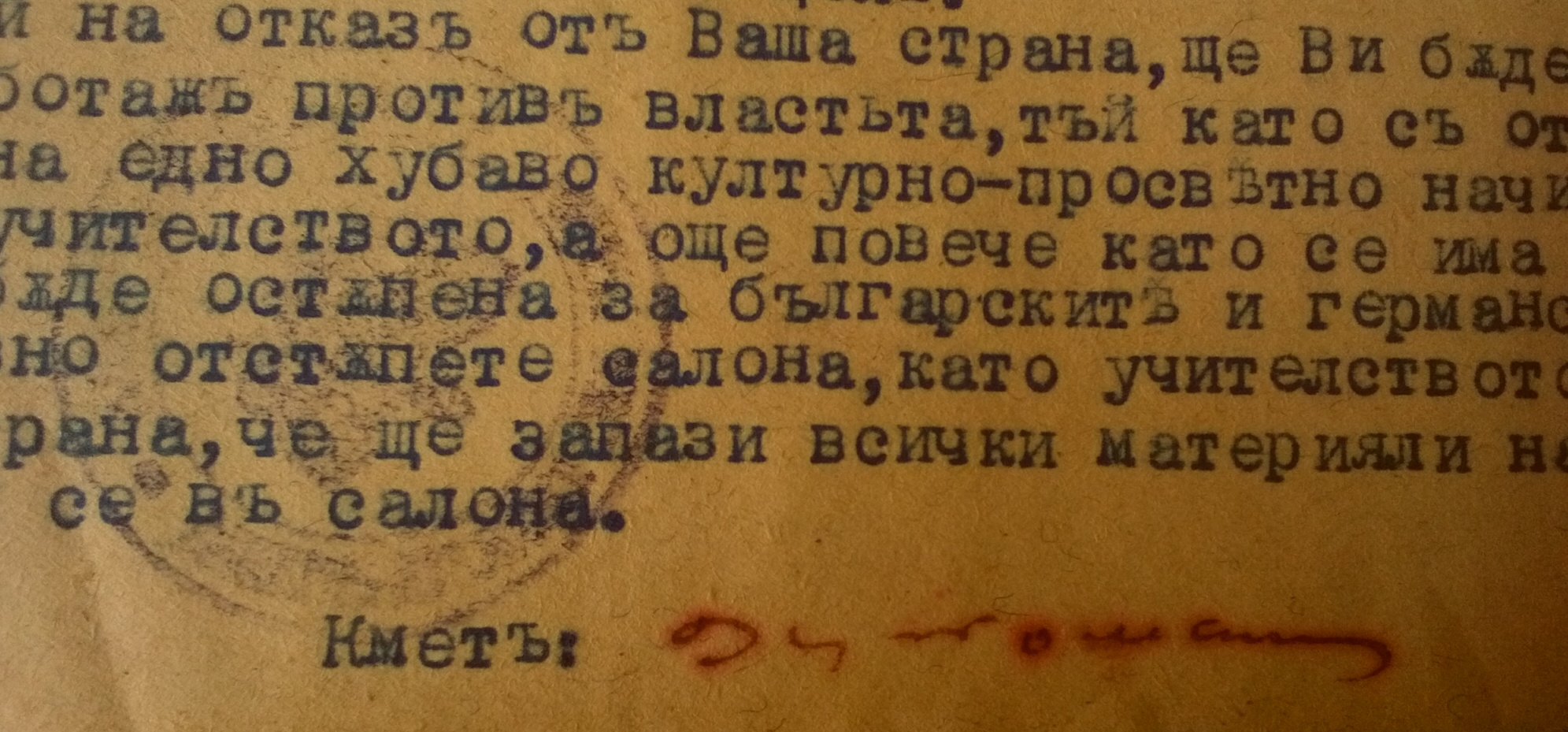 В случай на отказ от Ваша страна, ще Ви бъде съставен акт за саботаж против власта, тъй като с отказа си ще попречите на едно хубаво културно-просветно начинание от страна на учителството, а още повече като се има предвид, че сумата ще бъде отстъпена за Българските и Германските войници, то безусловно отстъпете салона, като учителството се задължава от своя страна, че ще запази всички материали на кооперацията намиращи се в салона.