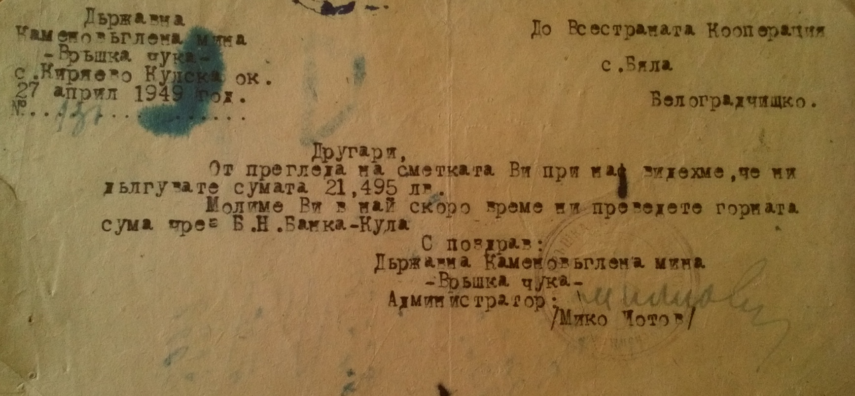 Моля да преведете сумата 21,495 лева чрез Б.Н.Банка – Кула.