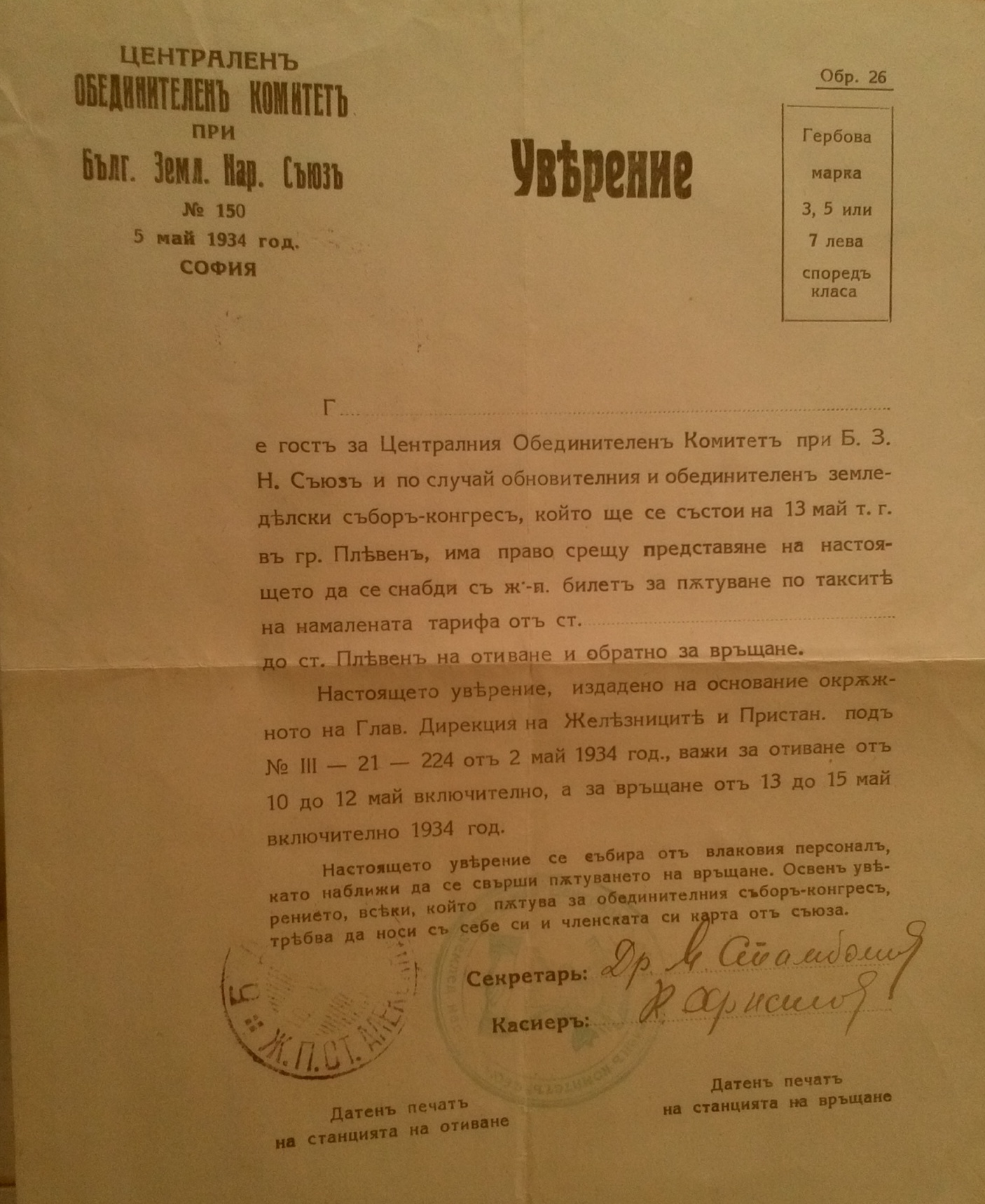 Датен печат за станция на тругване е сложен печат на гара Александрово, за връщане няма поставен печат. Няма попълнено име , (кой е участвал в земеделския събор – конгрес.)