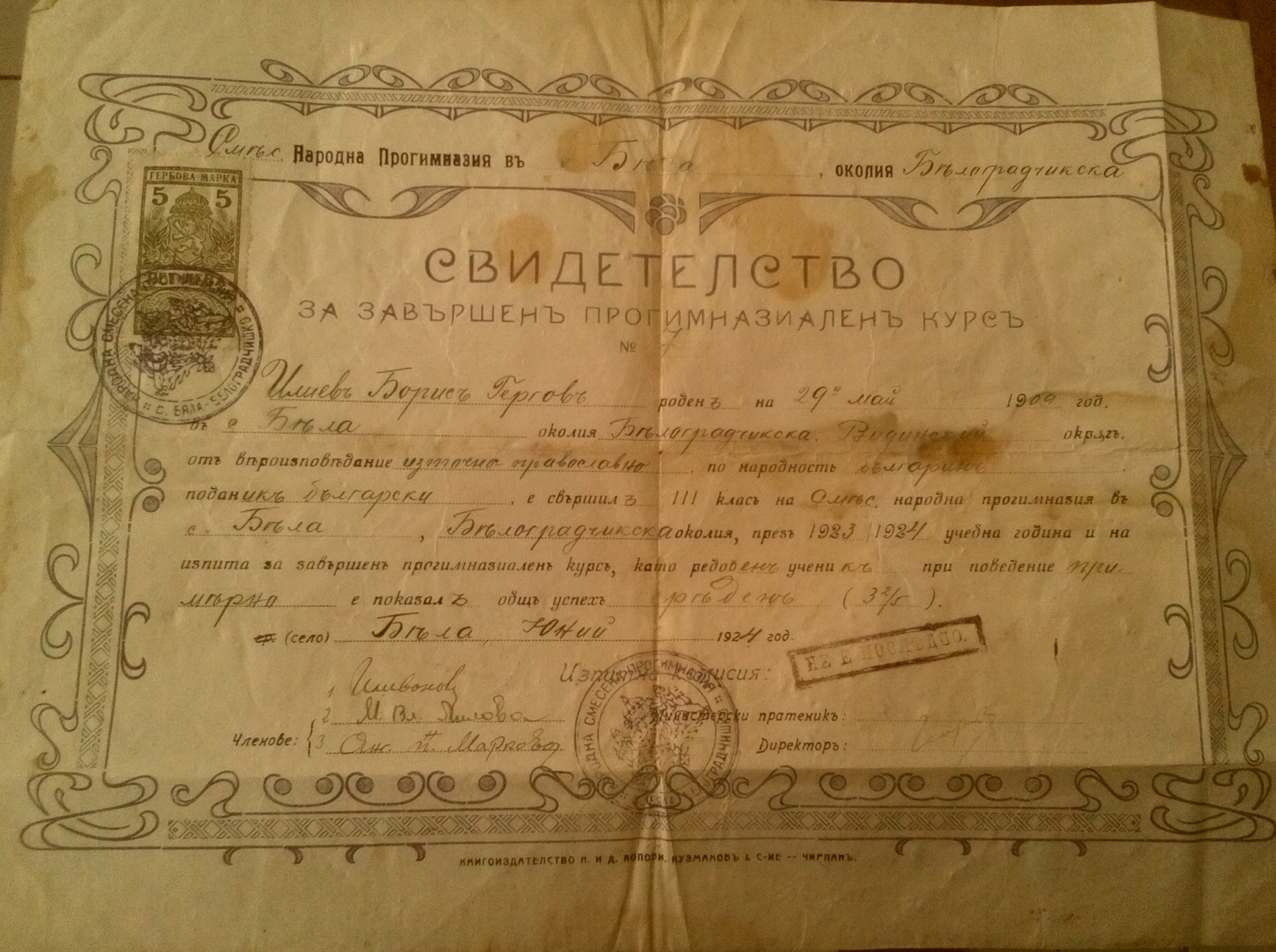 Свидетелство: Илиев Борис Гергов род. сБела 29.5.1909 г.