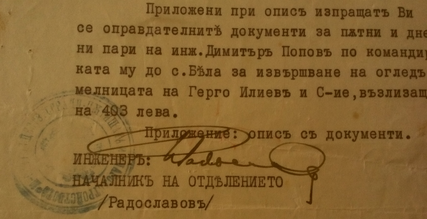Печат: Инжинер началник на отделението Е.И.З. /П/ Радославов