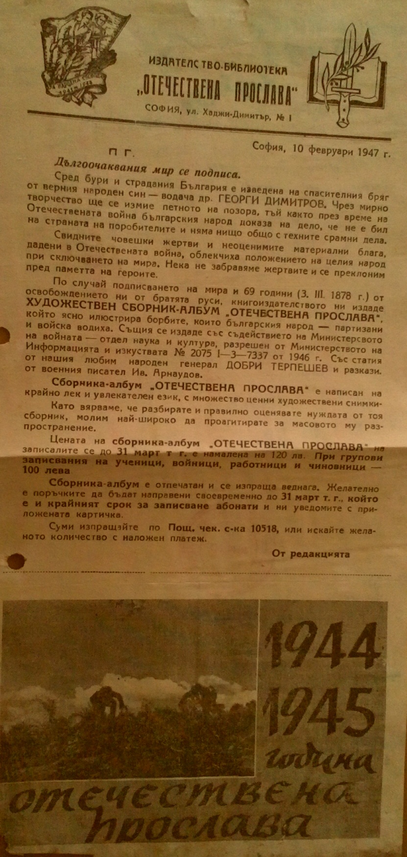 По случай подписването на мира и 69 год. (3.03.1878г.) се издава ХУДОЖЕСТВЕН СБОРНИК-АЛБУМ “ ОТЕЧЕСТВЕНА ПРОСЛАВА“ със статия от нашия любим народен генерал Добри Терпешев и разкази от военния писател Ив.Арнаудов….