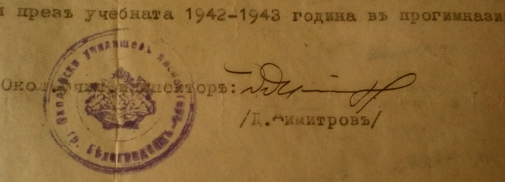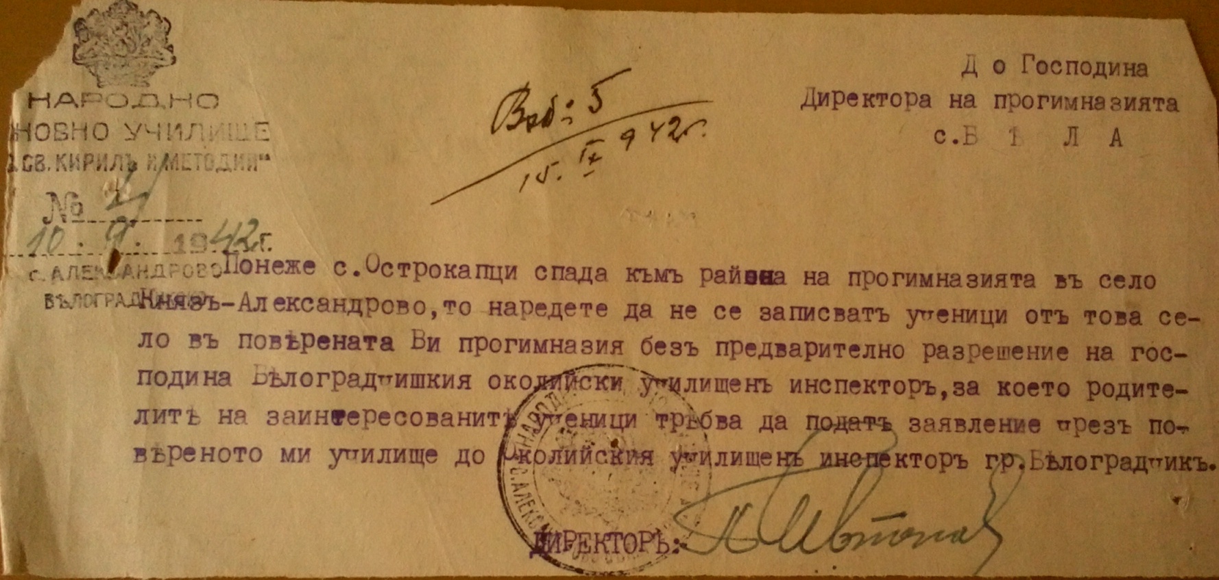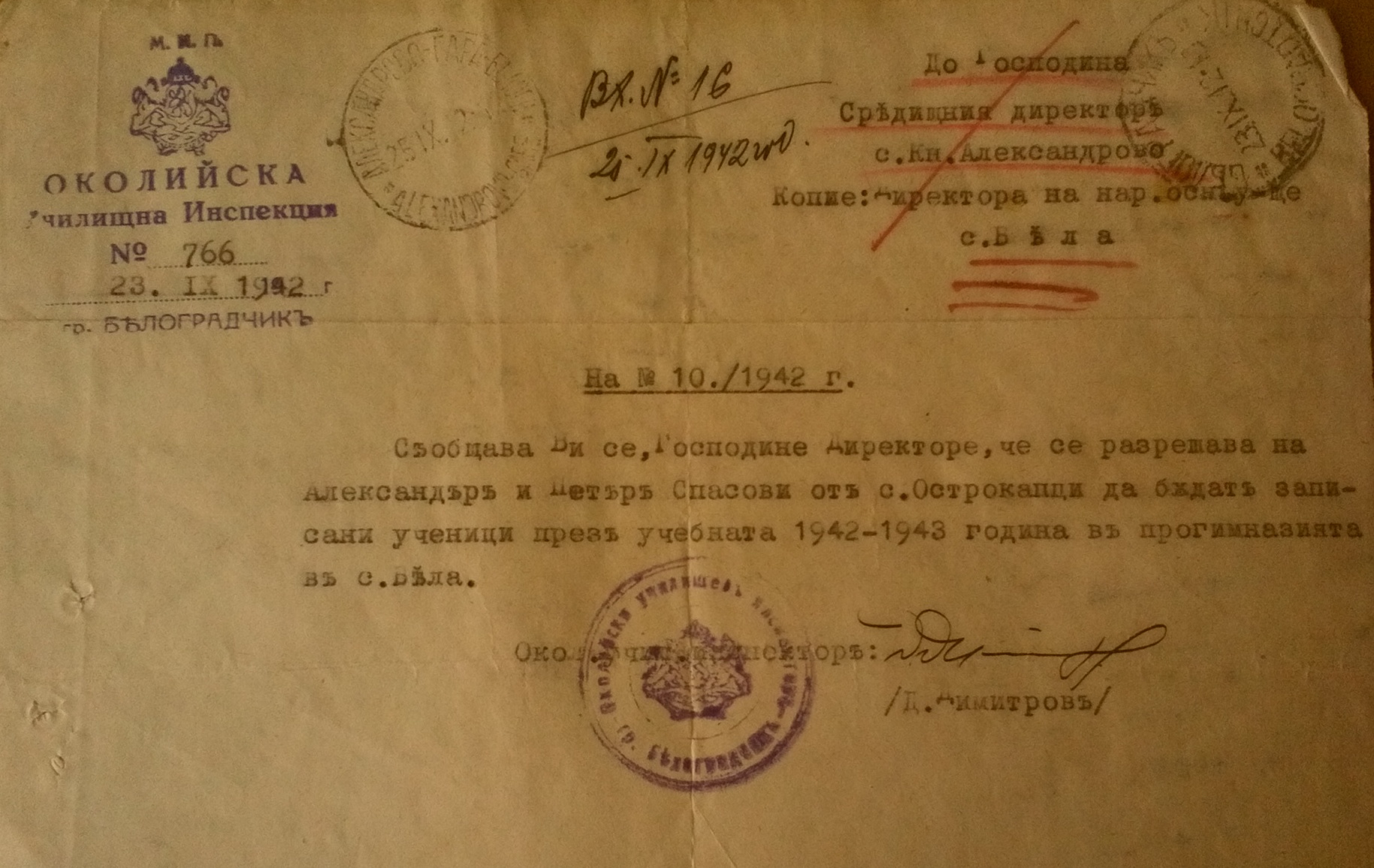Съобщава ви се Г-н Директоре, че се разрешава на Александър и Петър Спасови от село Острокапци да се запишат ученици в прогимназията в село Бела за учебната 1942/43 година.