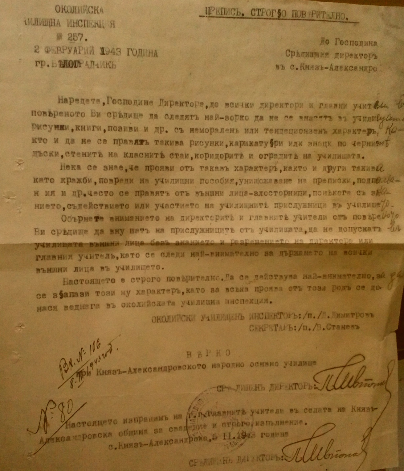 Настоящето е строго поверително. Да се действува най-внимателно, за да се запази този му характер, като за всяка проява от този род се донася в околийската училищна инспекция.