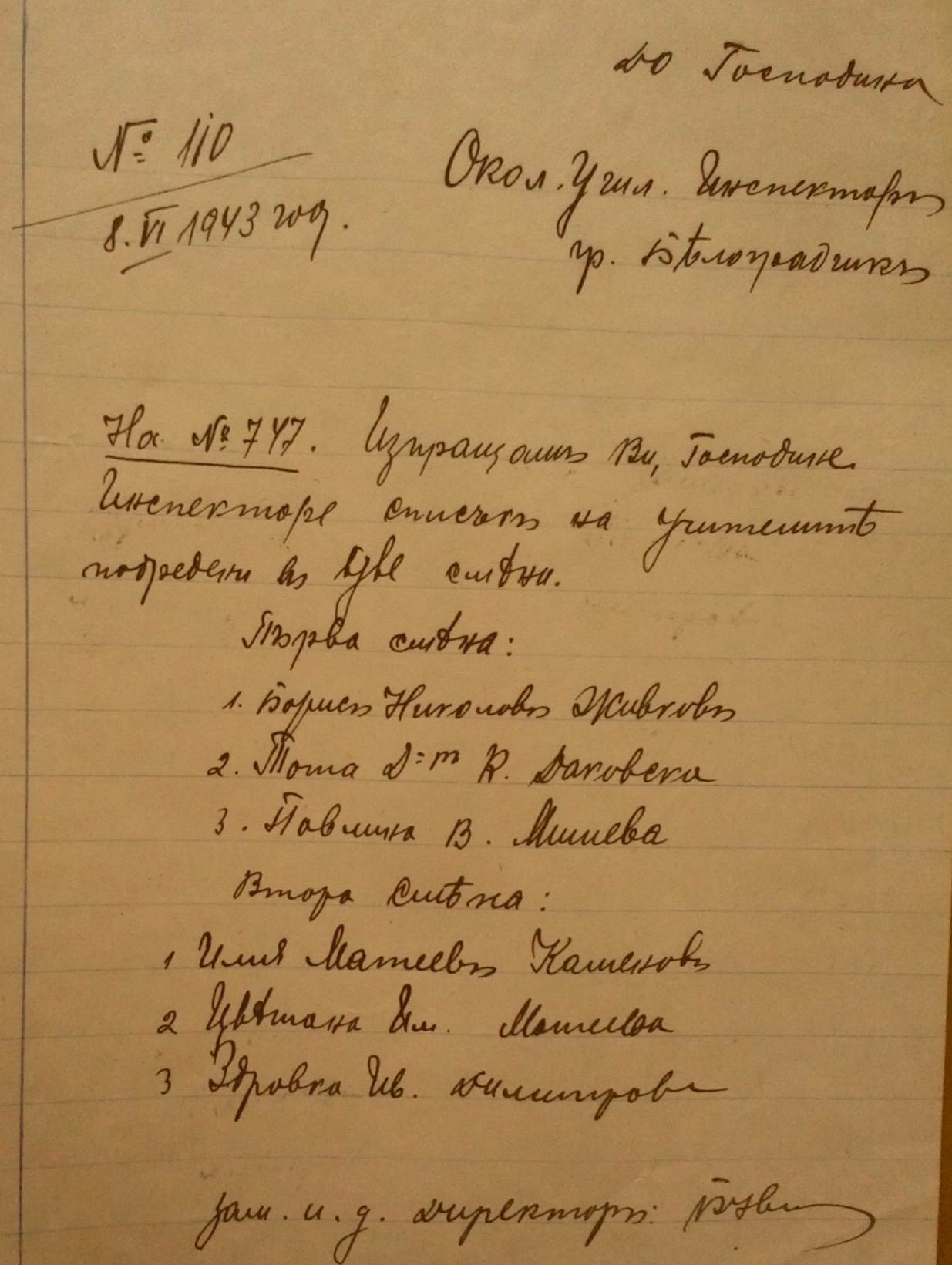 До Околийския Училищен Инспектор, гр.Белоградчик. Две смени на учителите: