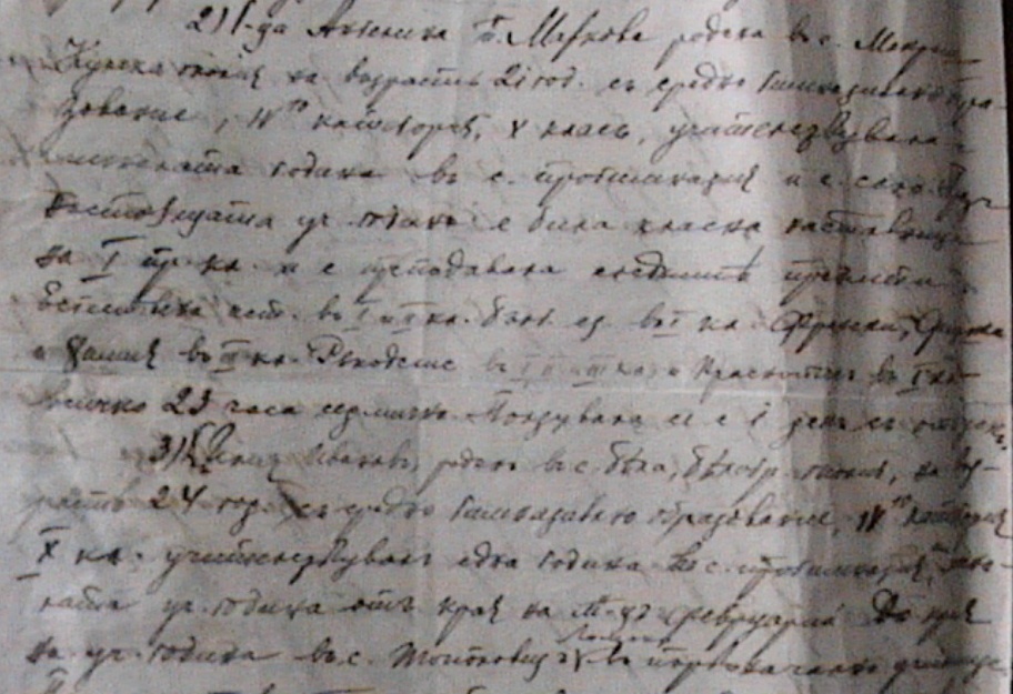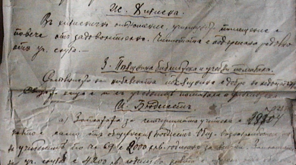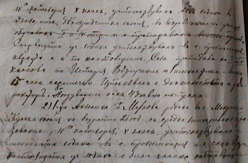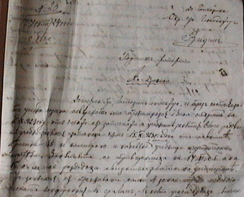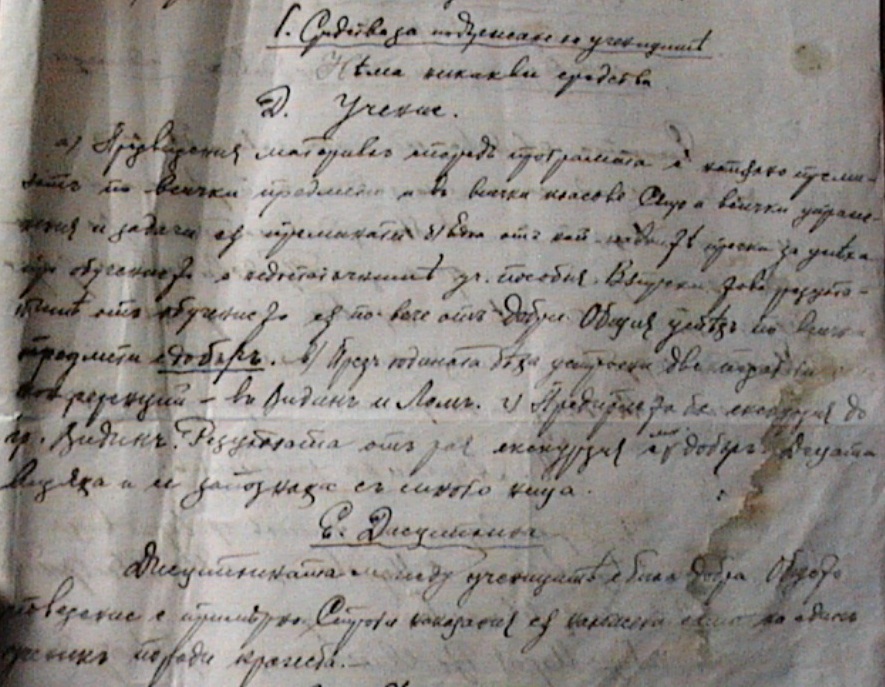 Донасям Ви. Господин инспекторе, че през настоящата учебна година поверената ми прогимназия е била открита на 15.09.1923 год. от когато се започнаха и учебните занятия. Обаче редовните учебни знятия започнаха към 15.10.1923 год .. Една от главните причини бе ненамиране и набавяне о време учебници и ученически потреби. Занятията се привършиха на 14.04. с.г. а на 15 с.м. се раздадоха свидетелствата на учениците. Учебните знятия са прекъсвани само 4 дена поради педагогическата конференция в гр. Лом, в която участваха всички учители от поверената ми прогимназия. Всички училищни празници са отпразнувани, заедно с местния и патронен празник на прогимназията …..