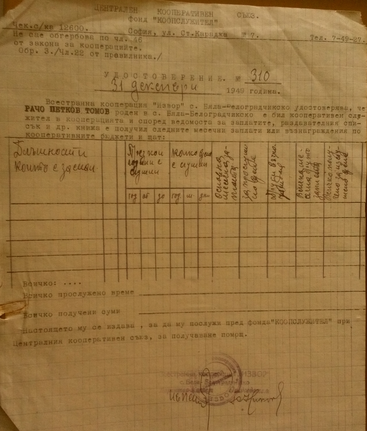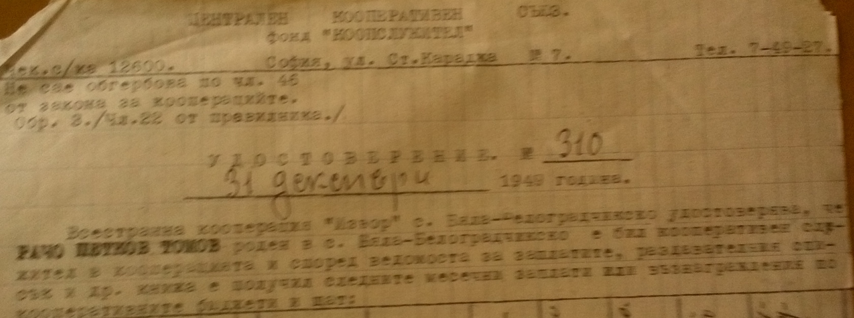 Всестранна Кооперация „Извор“ удостоверява, че Рачо Петров Томов е бил нейн кооперативен служител. Настоящето му се издава за да му послужи пред фонд „КООПСЛУЖИТЕЛ“ при Централния Кооперативен Съюз, за получаване на помощ.