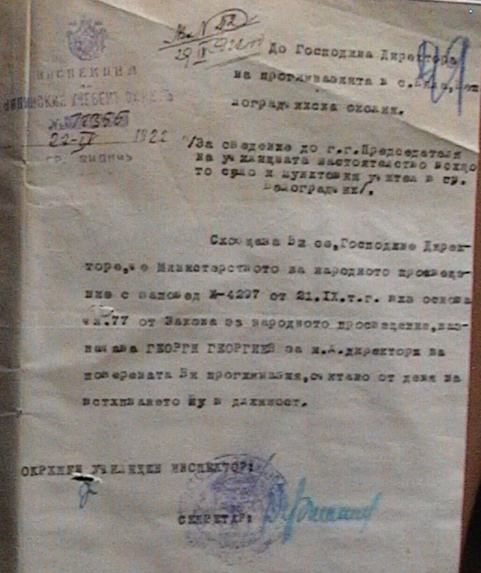 Министерството на Народното Просвещение със заповед N 4227 от 21.09 1922 год. назначава за и.д. Директор на Прогимназията в село Бела.