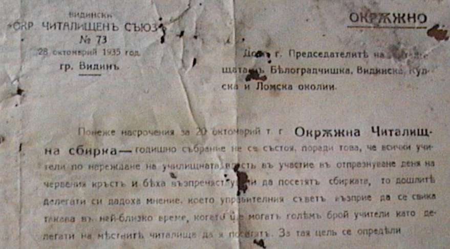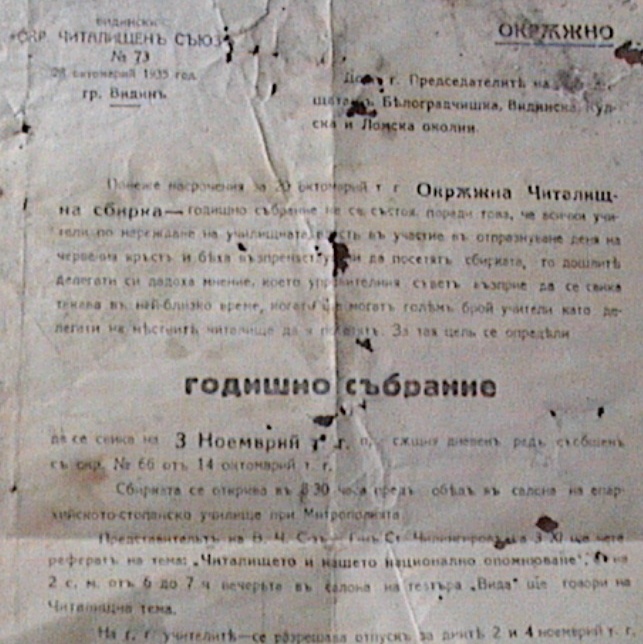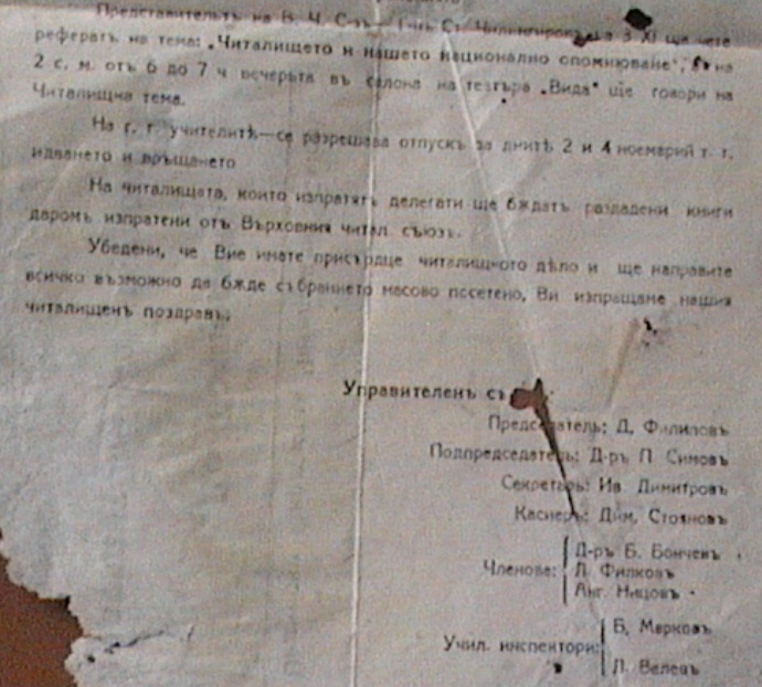 Председателят на В.Ч. С-з / Върховния Читалищен Съюз/ Г-н Ст.Чилингиров на 03.11. 1935 г. ще чете реферата на тема: “ Читалището и нашето национално опомнюване……..
