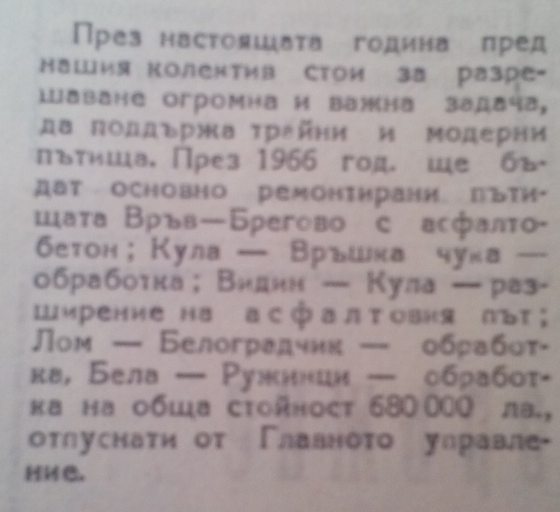 През 1966 година ще бъдат основно ремонтирани пътищата………….“Село Бела – Село Ружинци….“
