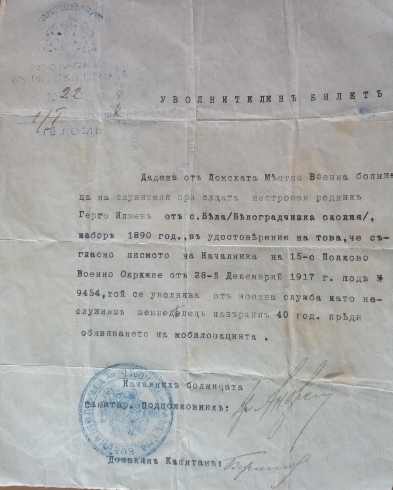 Съгласно писмо на Началника на 15-то Полково Военно Окръжие от 28.12.1917 г. под N 9495 ……той се уволнява от военна служба като неслуживш земеделец навършил 40 години, преди обявяване на мобилизацията.