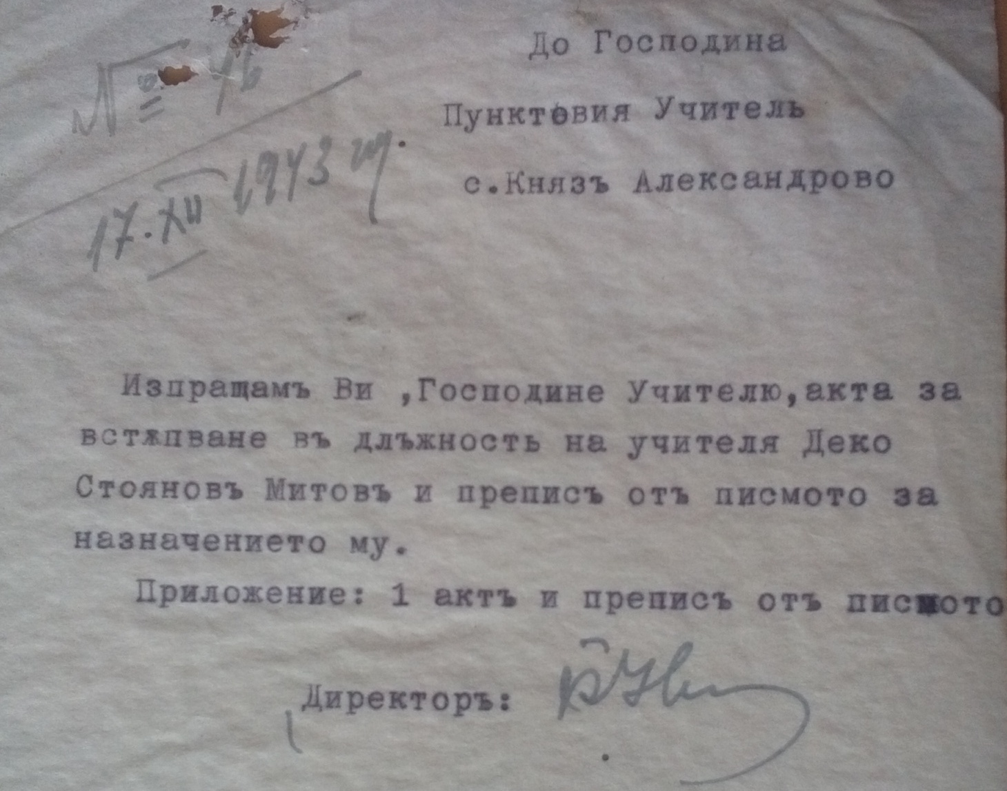 До пунктовия Учител в село Княз Александрово, изпращам Ви …..акта……..