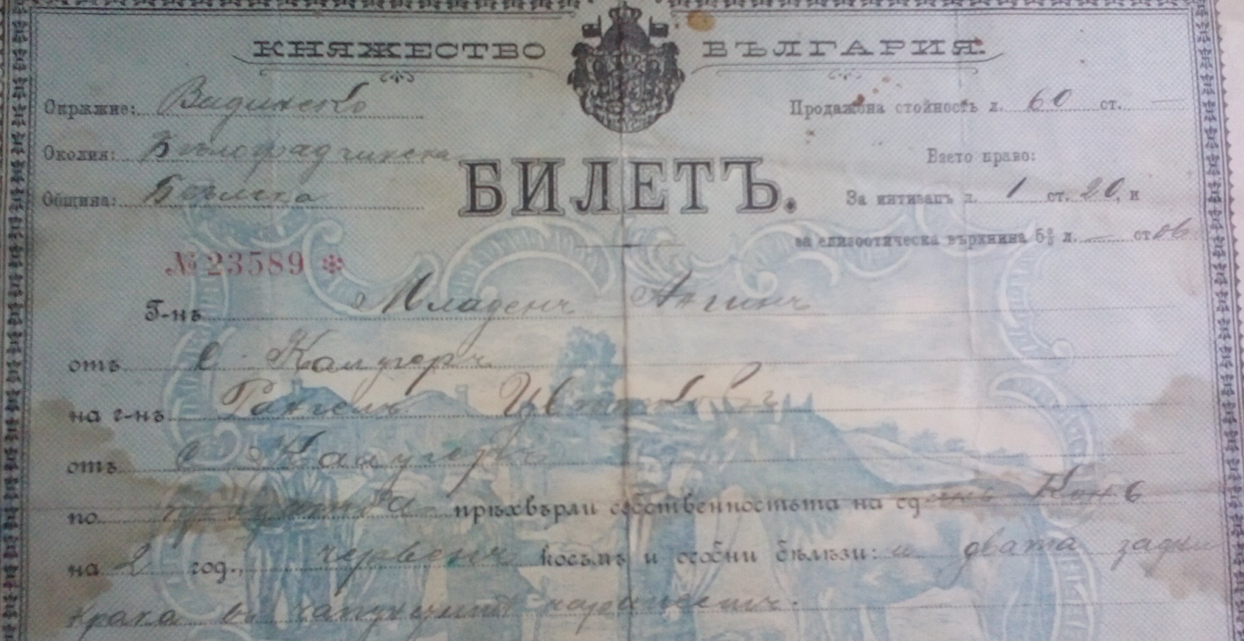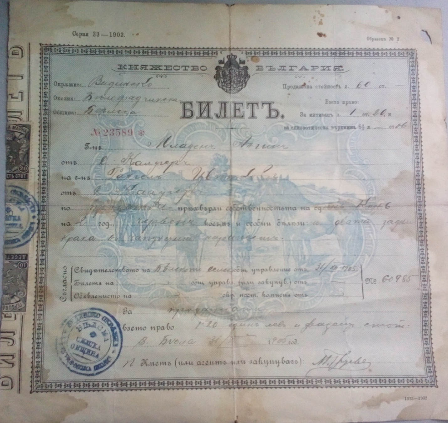 Свидетелство на Белското селско общинско управление N 60985 за продажбата на един кон.
