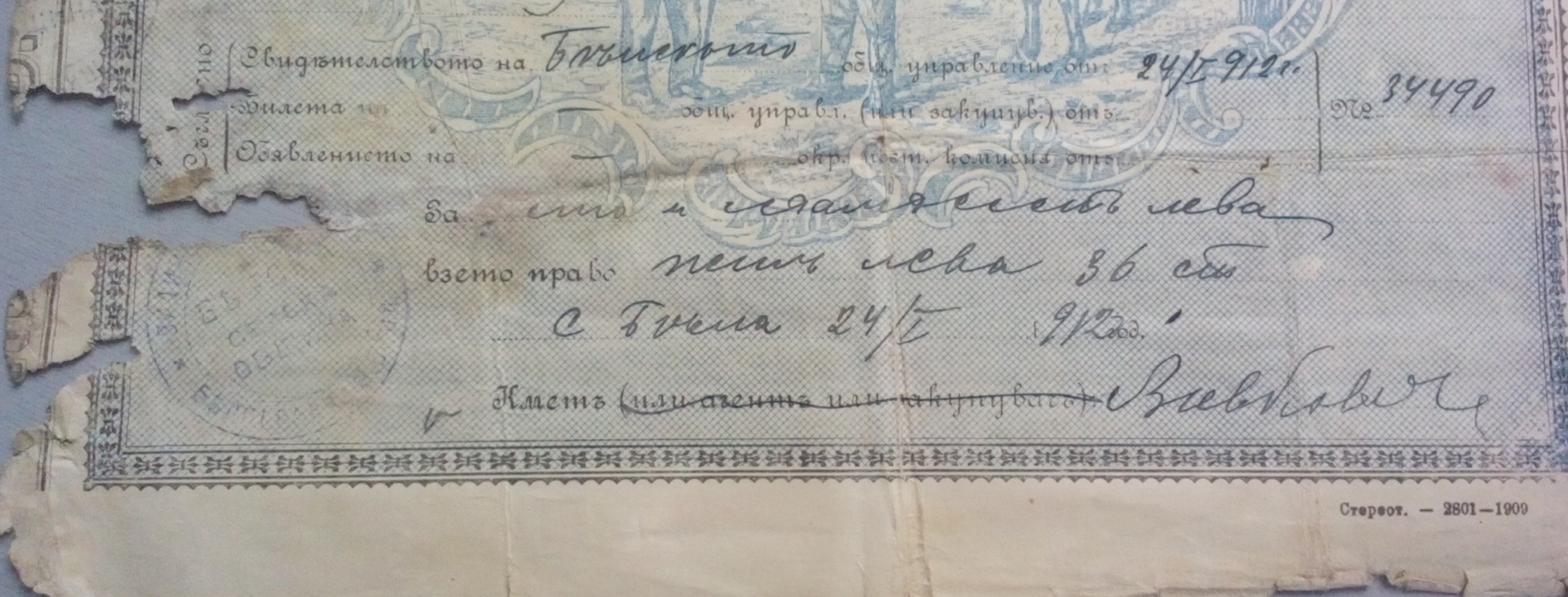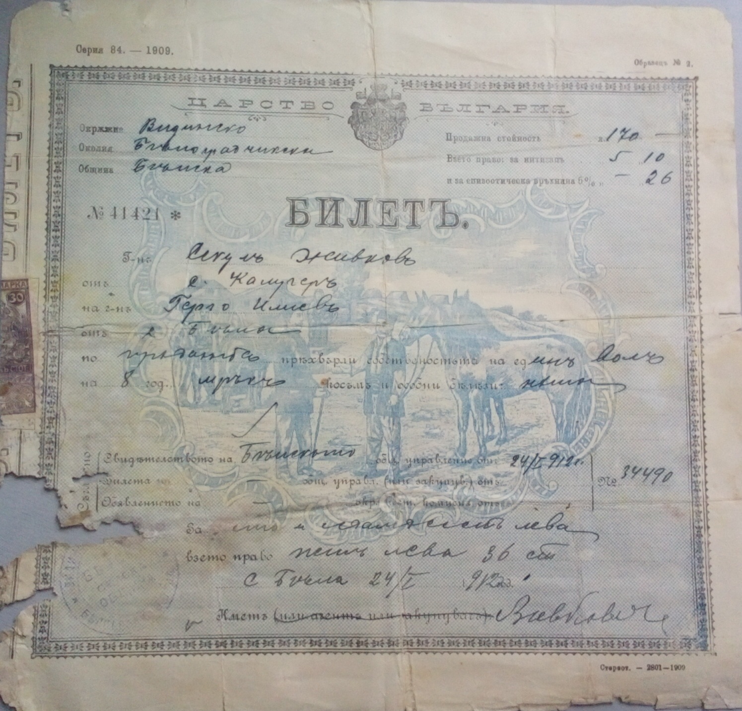 Свидетелство на Белското Общинско Селско Управление N 34490 относно продажбата на еди вол от Г-н Секул Живков от с.Калугер на Г-н Герго Илиев от с.Бела.