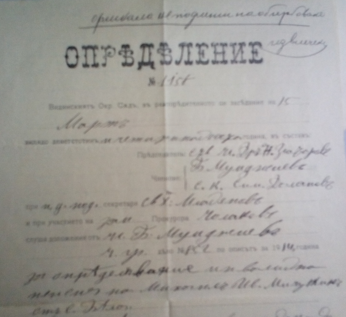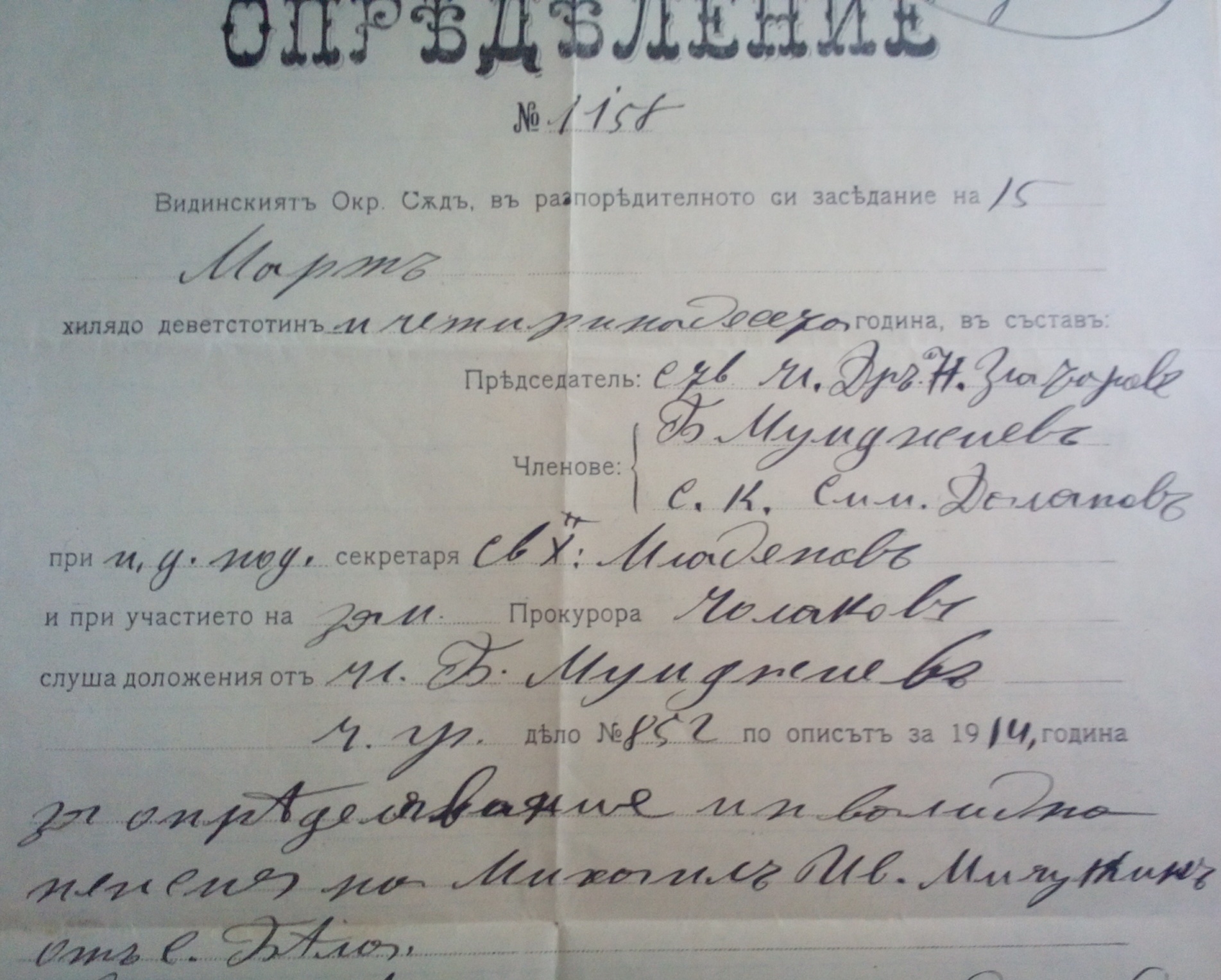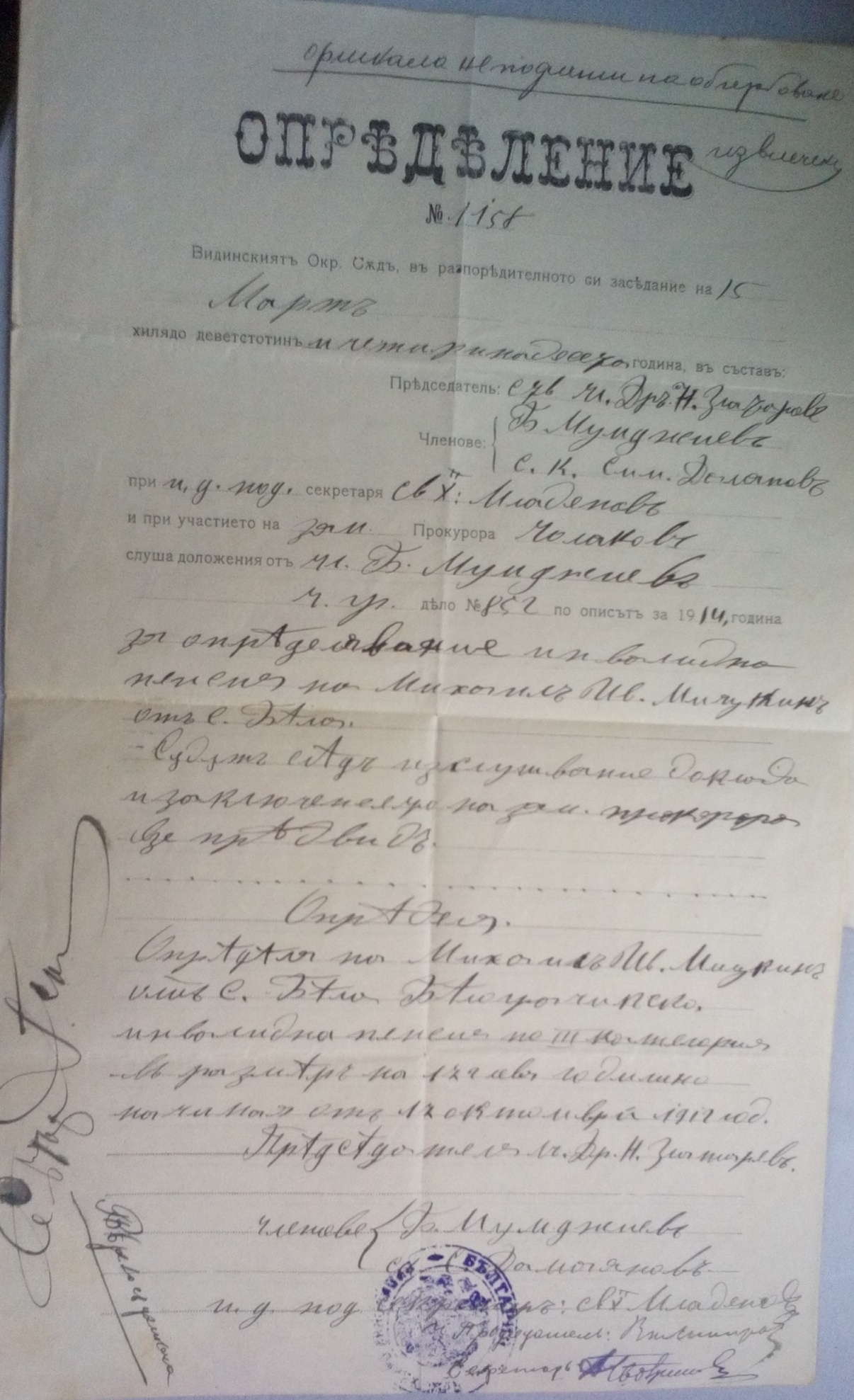 Видинският Окръжен Съд Определа на Михаил Ив. Мицкин от село Бела, Белоградчишко инвалидна пенсия по трета категория в размер на 172 лева, годишно начиная от 17 Октомврий 1912 година.