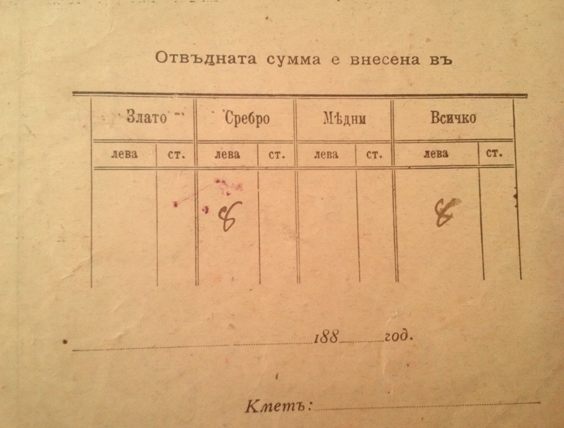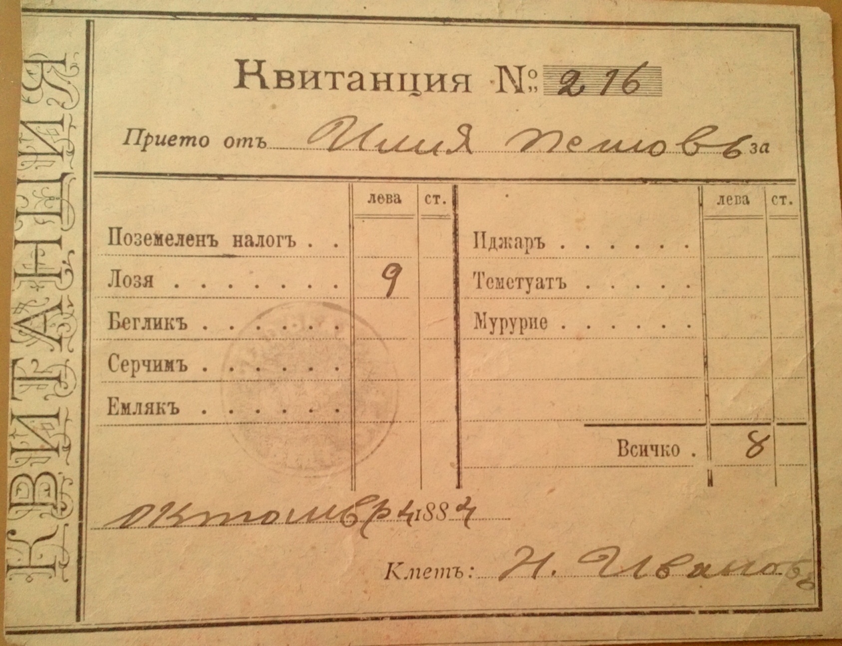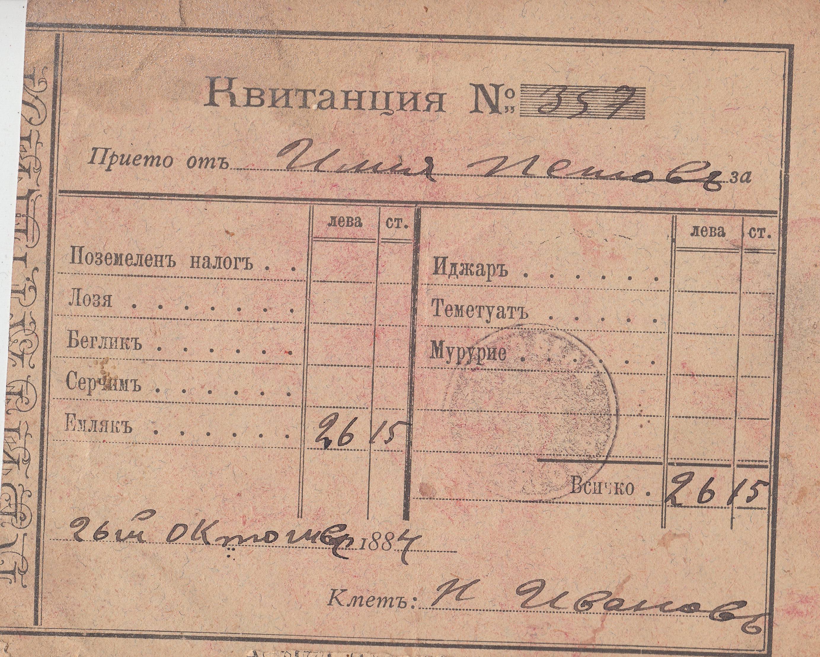 Квитанция N 357, издадена от Кмета Никола Иванов на Илия Пешов на 26 Октомврий 1884 година.