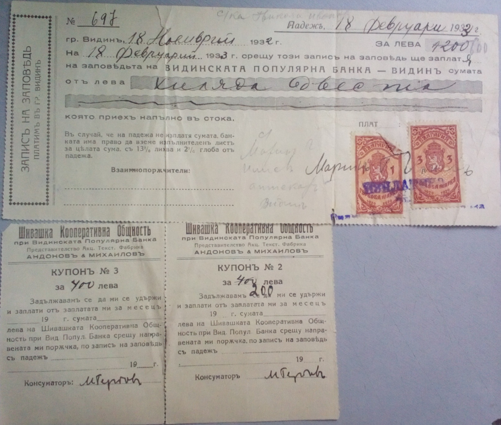 Шивашка Кооперативна Общност при Видинската Популярна Банка, Представителство Акц. Текст.Фабрика Андонов & Михайлов